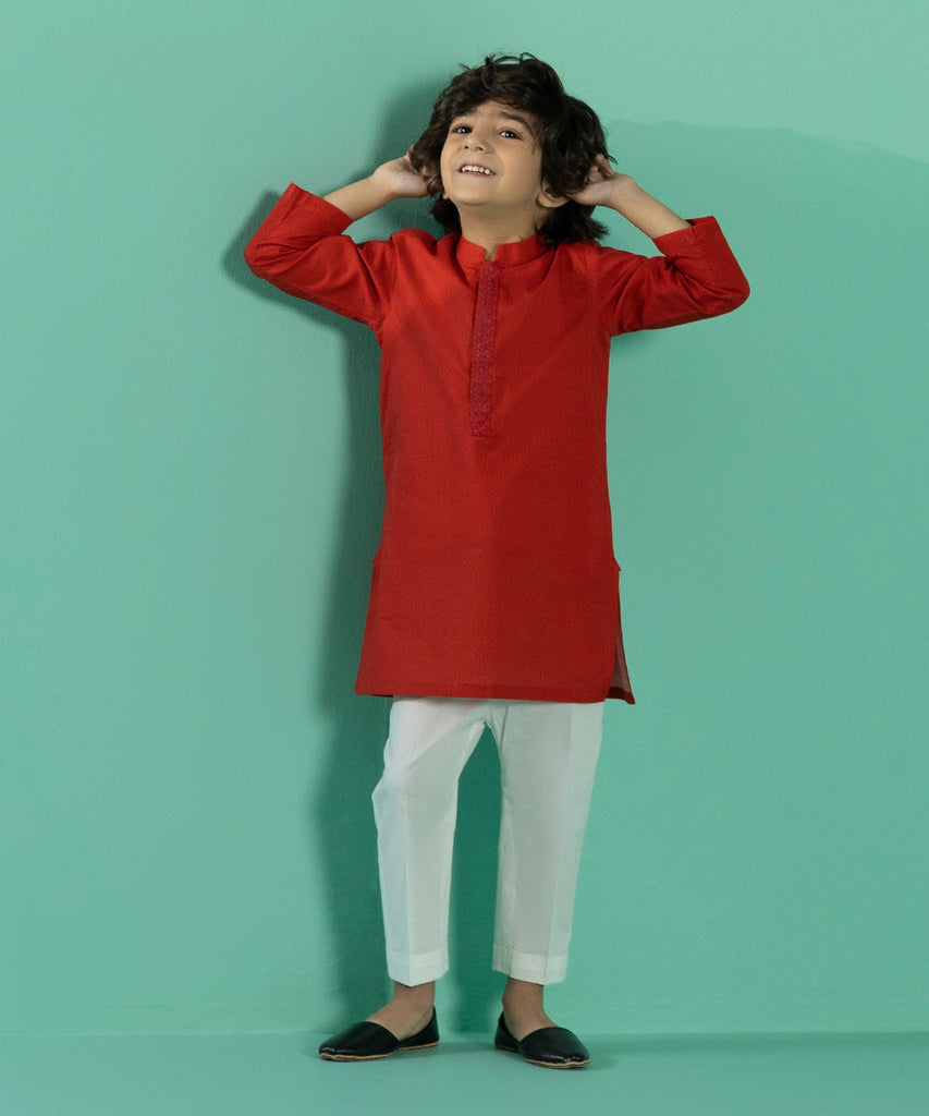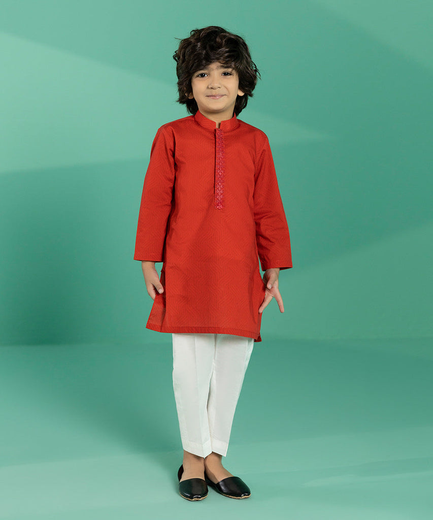Opt for vibrant kurtas this summer with this rust embroidered straight kurta in cambric featuring printed sleeves.