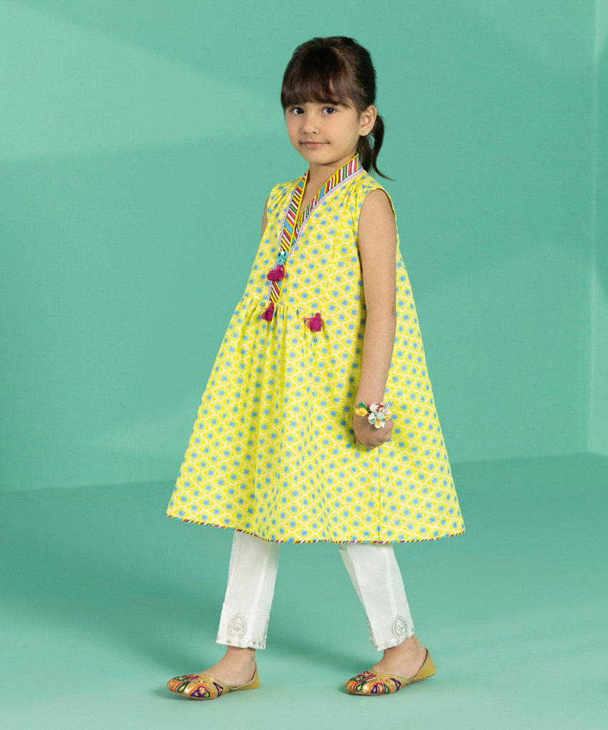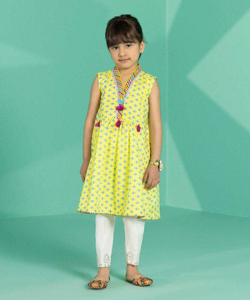 Embrace summer with this yellow front gathered frock featuring stitching details and tassels. Details: Colour: Yellow...