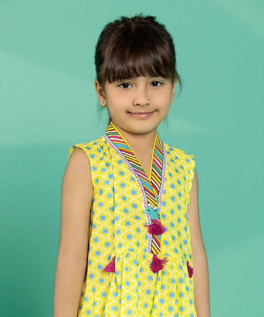 Embrace summer with this yellow front gathered frock featuring stitching details and tassels.
