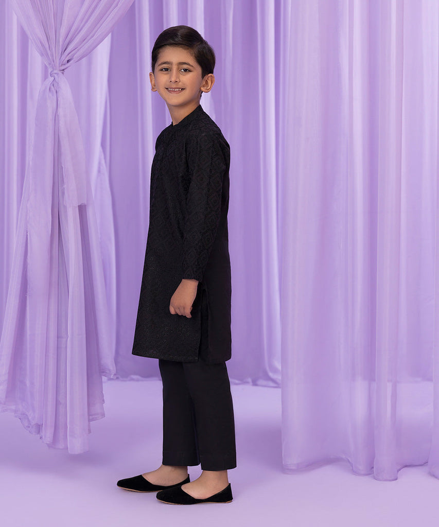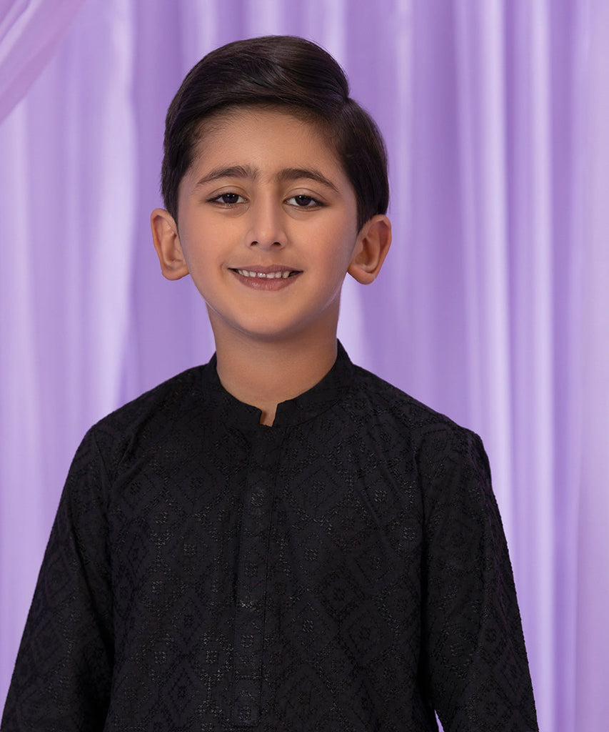 This Eid, dress your little one in black schiffli embroidered straight kurta featuring hidden placket with stitching details.