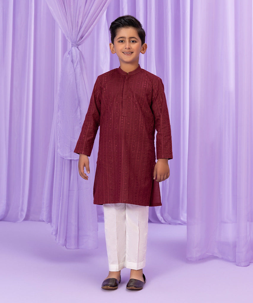 This Eid, dress your little one in maroon schiffli embroidered straight kurta featuring hidden placket with stitching details.