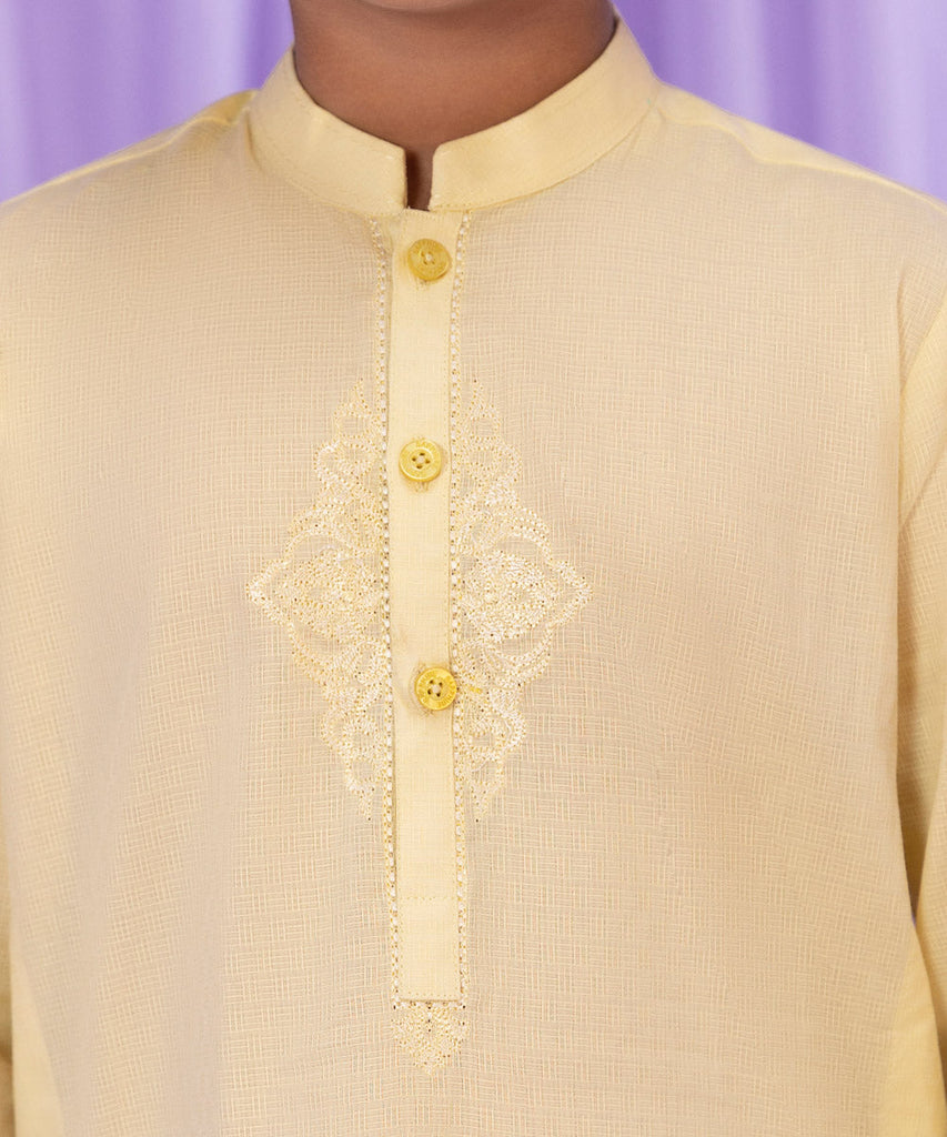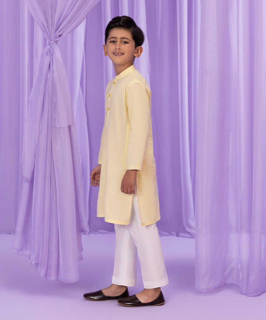 This Eid, elevate your little one's style in lime yellow straight embroidered kurta in dobby.