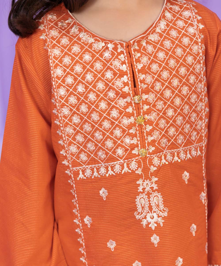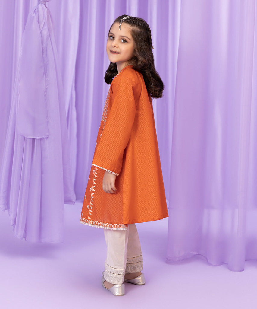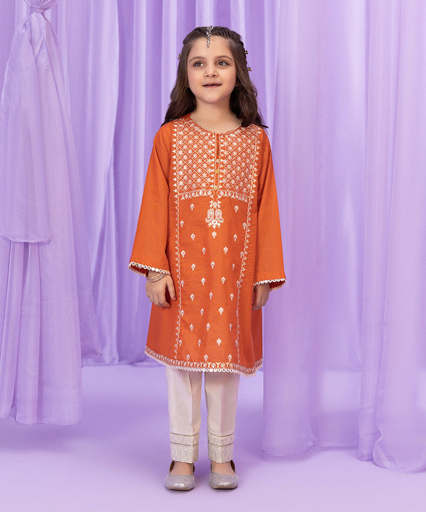 This Eid, dress your little one in orange A-line with embroidery on front. Square armhole sleeves. Detailed with gota hanging and mirror lace.