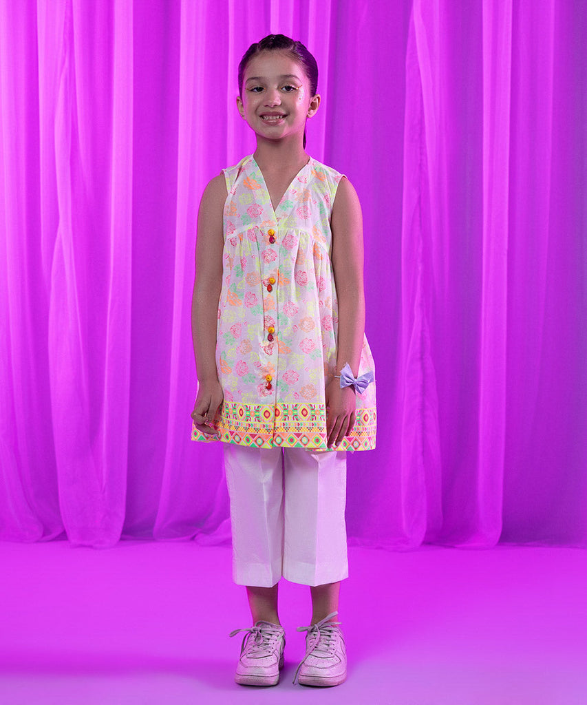 Let your little one shine in this neon printed flared frock with buttons and front open.