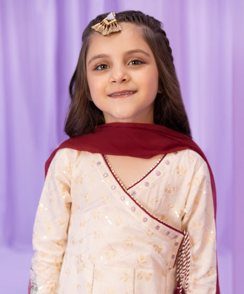 Dress your little one in cream Angrakha style frock with embroidery on hem border and sleeves. Detailed with dori and tassels. Paired with chiffon dupatta.
