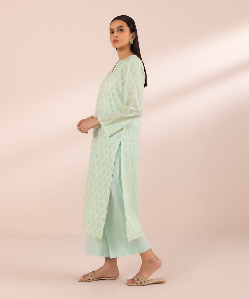 Look radiant in our pastel green, printed A- line shirt featuring a band neckline with slit.