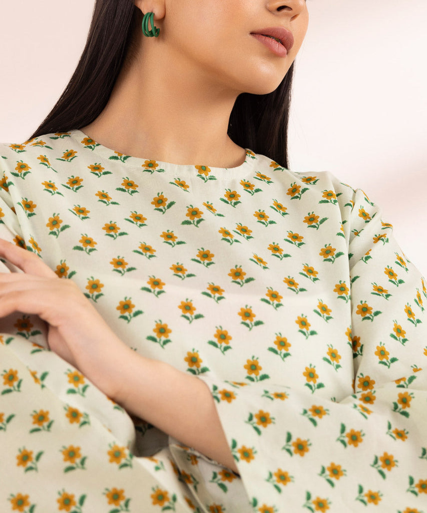 Standout with your summer style adorned in our dull cream white, printed straight shirt featuring a round neckline.