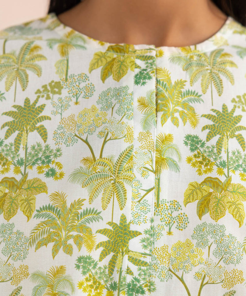 Elevate your summer style with our green and off-white, printed drop shoulder shirt featuring a round neckline with placket.
