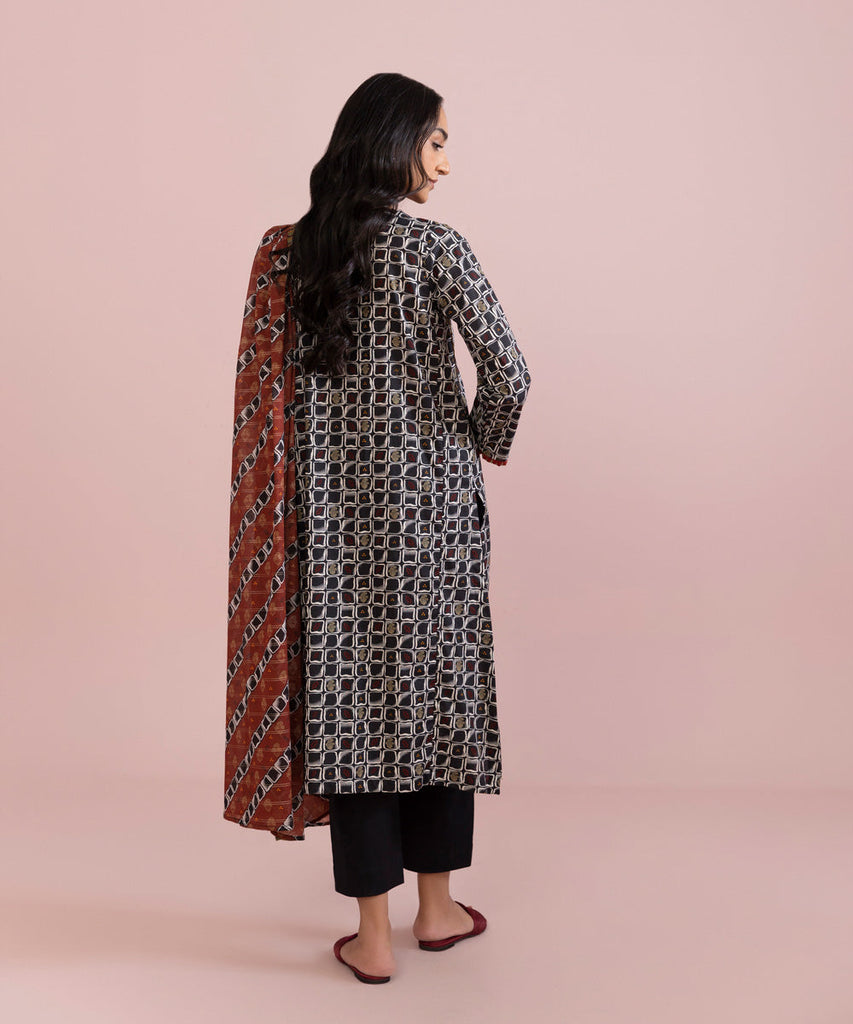 Channel your inner style this season with a black dainty patterned A-line silhouette featuring an embroidered neckline and a multihued zari dupatta.
