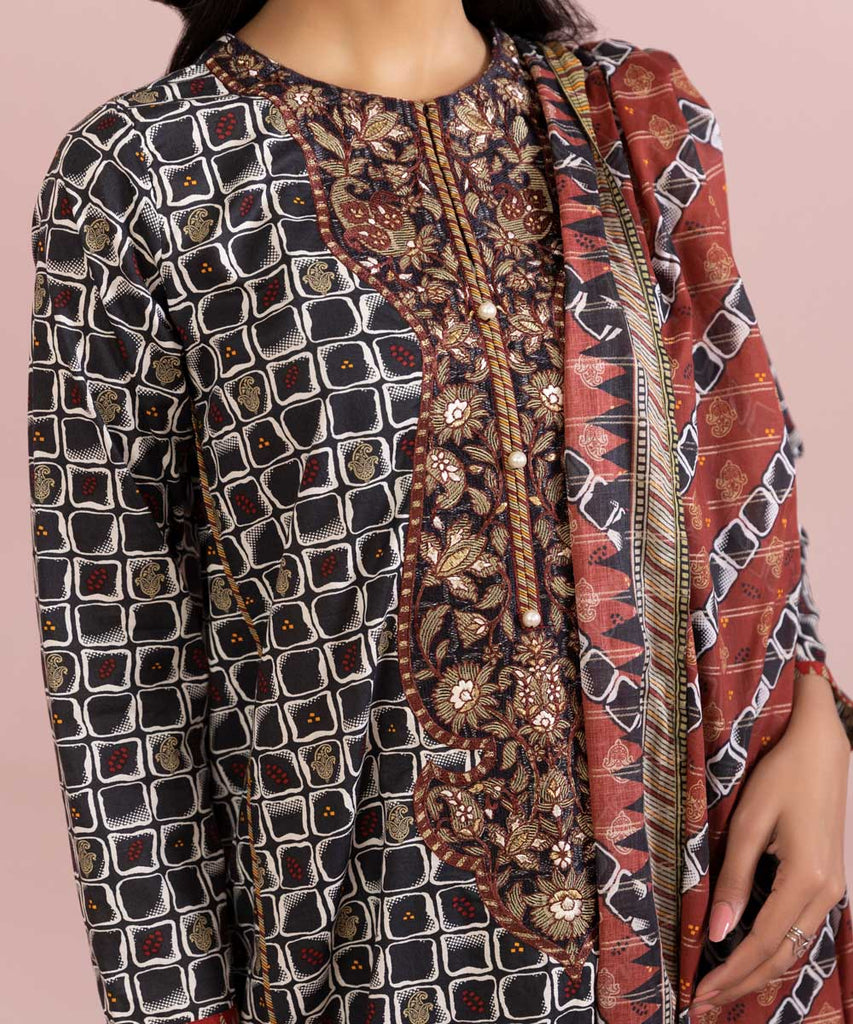 Printed Front With Embroidered Neckline, Printed Back, Full Sleeves, Round Neckline With Slit