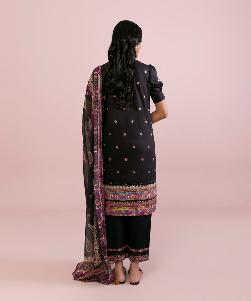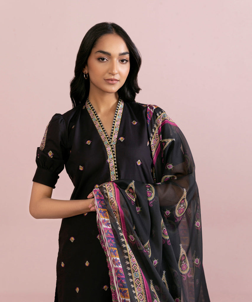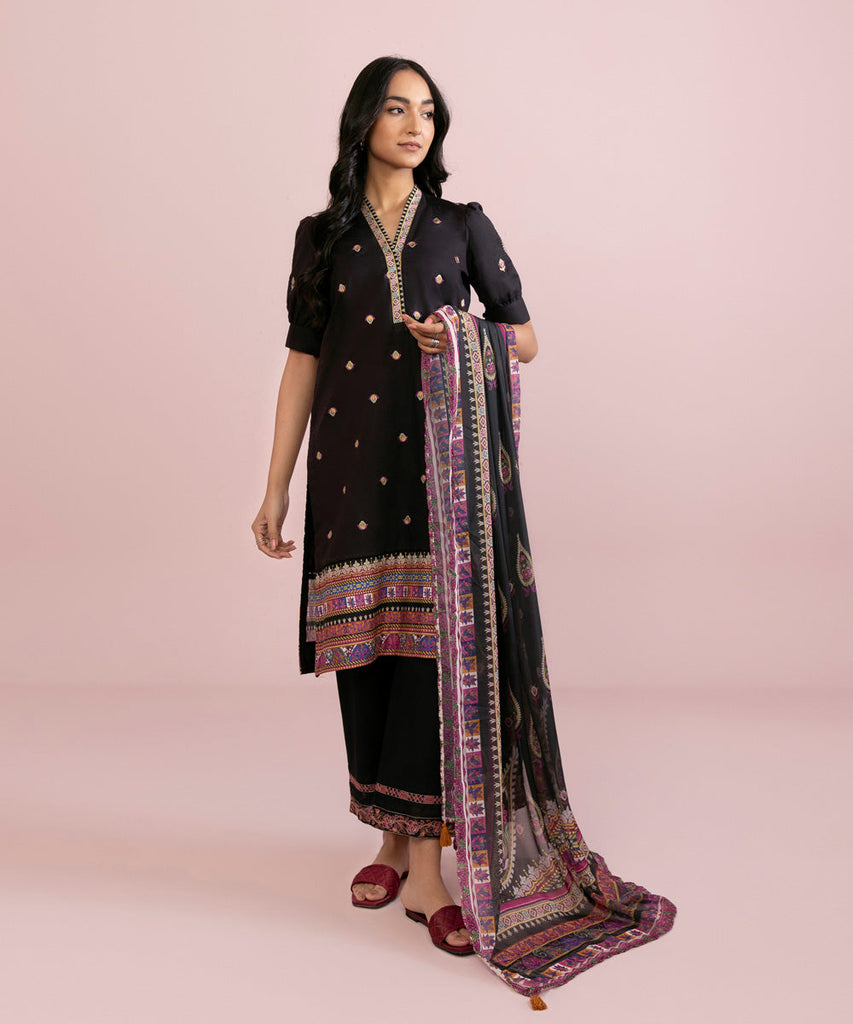 Channel your inner grace with this black straight silhouette featuring intricate embroidered detailing paired with a tissue dupatta.