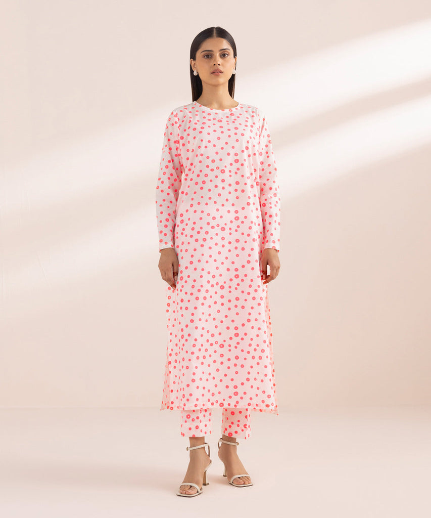 Curate a radiant summer look with our printed cambric, long A-line shirt in pink and white.