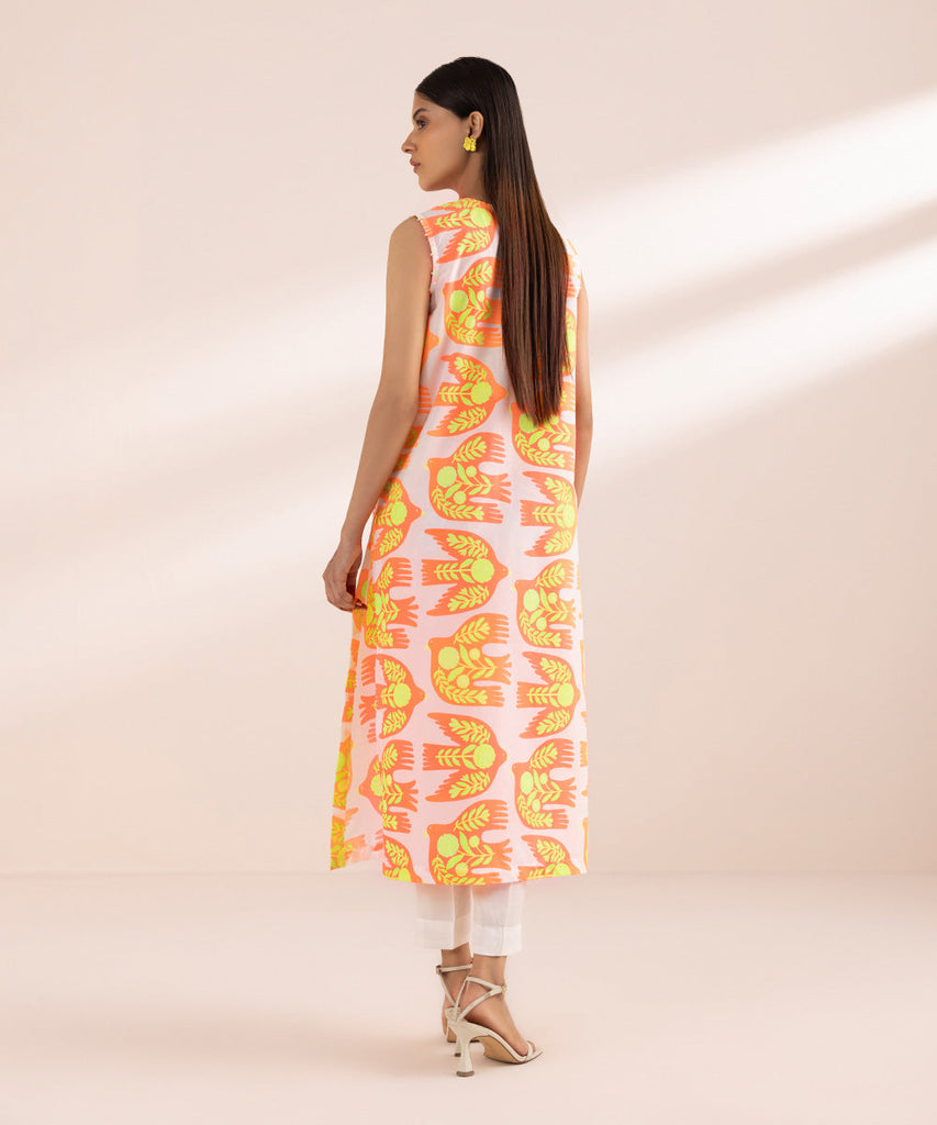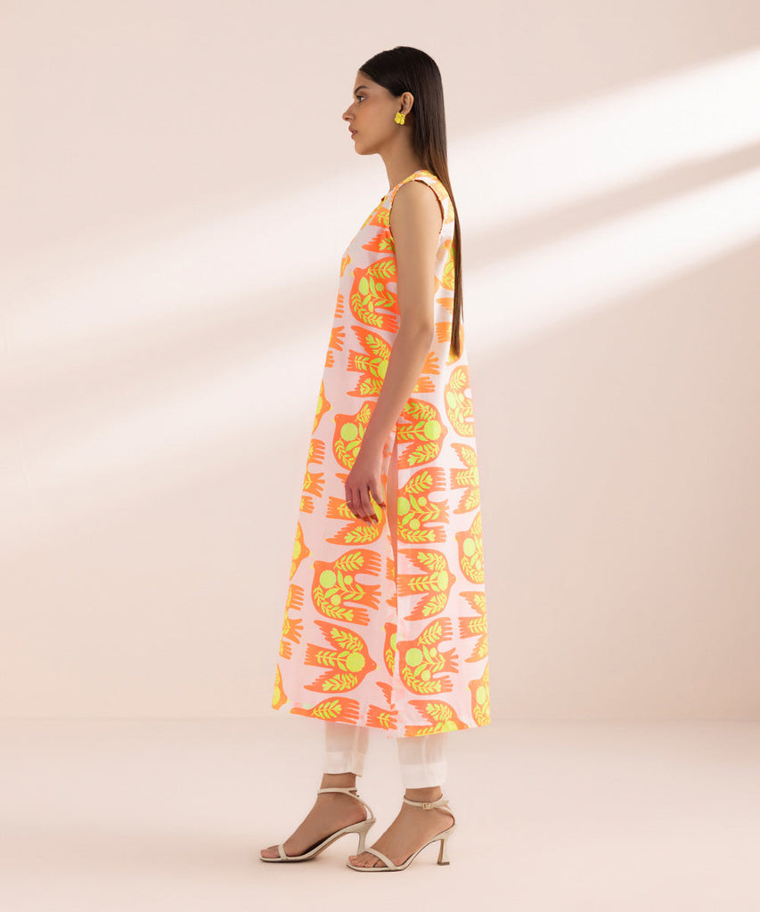 A-Line ShirtAdd a pop of colour to your wardrobe with our neon orange and white, printed cambric, sleeveless A-line s...