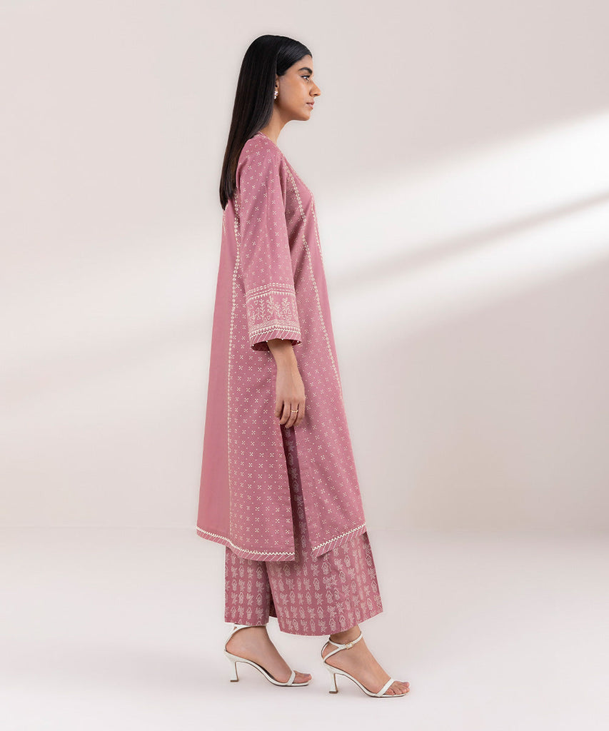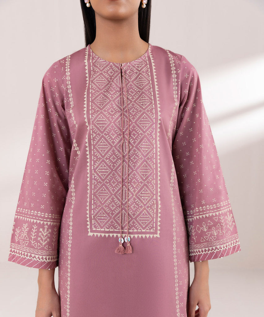 Elevate your festive ensemble with our mauve pink block printed A-line shirt featuring a round neckline with a slit.