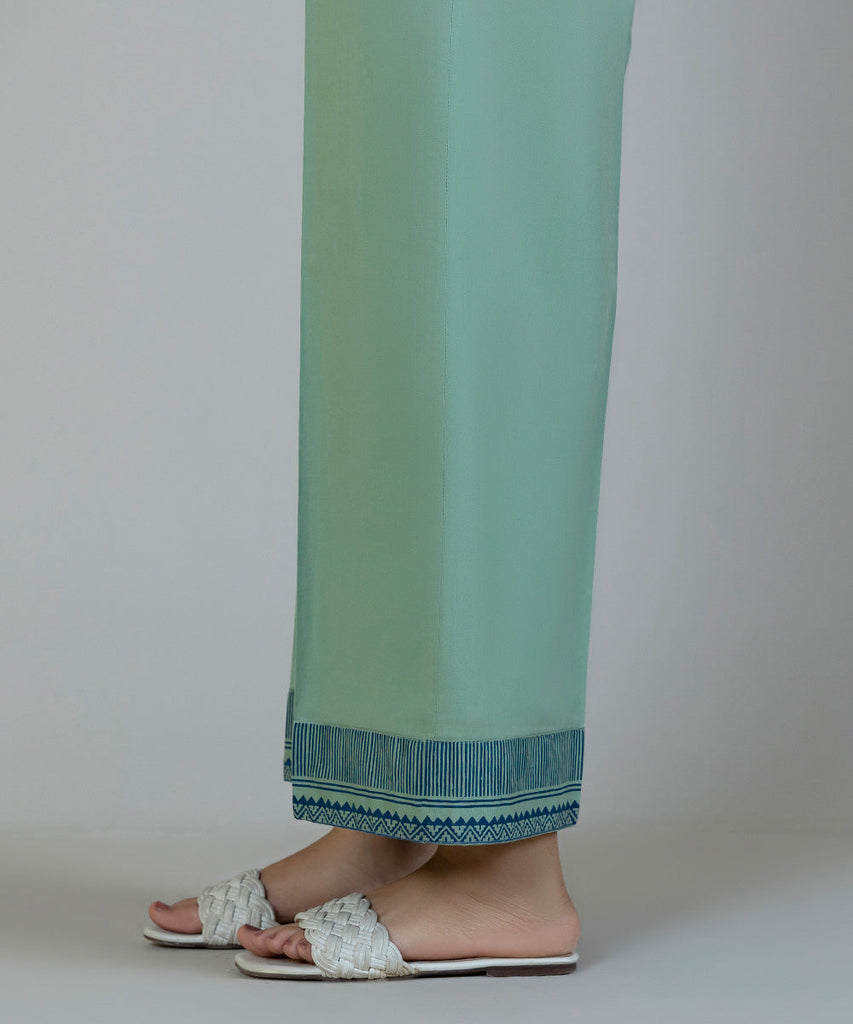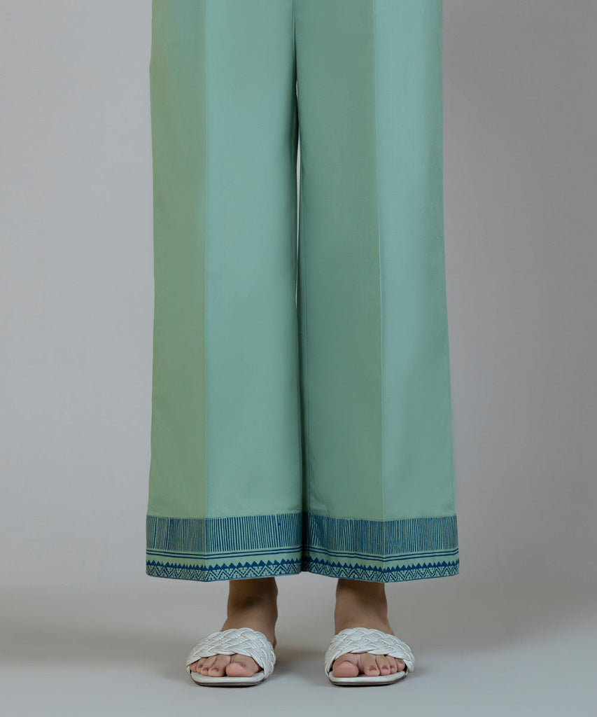 Complete your outfit with our tea green dyed culottes with printed borders.