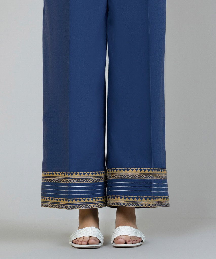 Complete your outfit with our dyed cobalt blue culottes with printed borders.