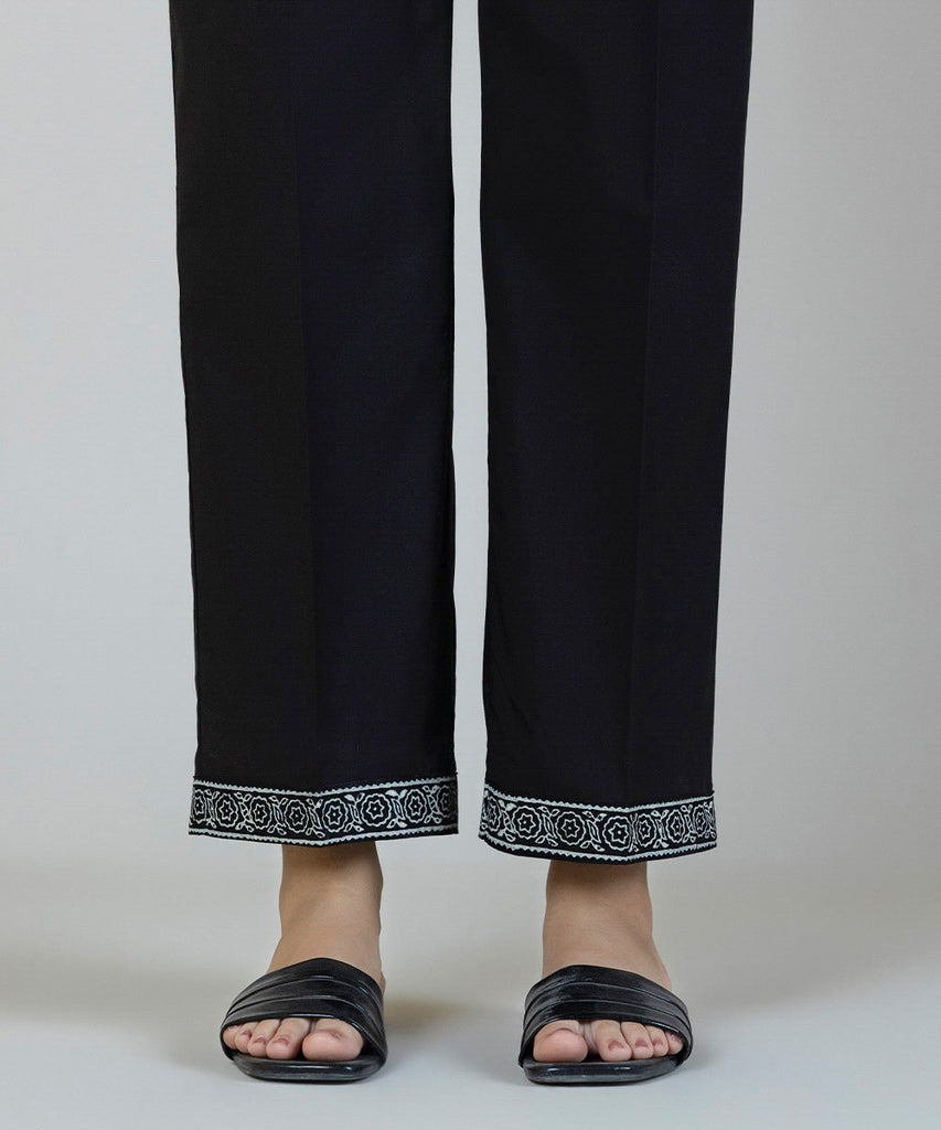 Complete your outfit with our dyed black straight pants with a block printed border.