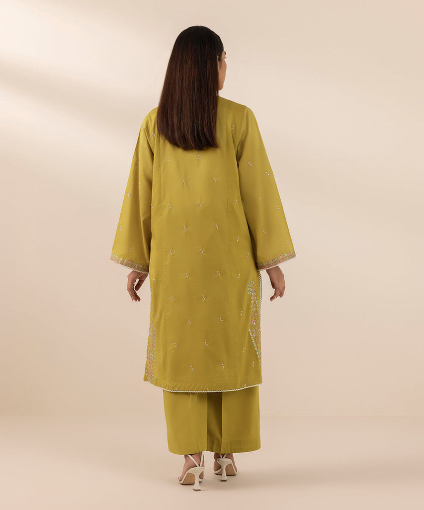 Curate the perfect festive look with our yellow green, straight embroidered shirt featuring a round neckline with slit.