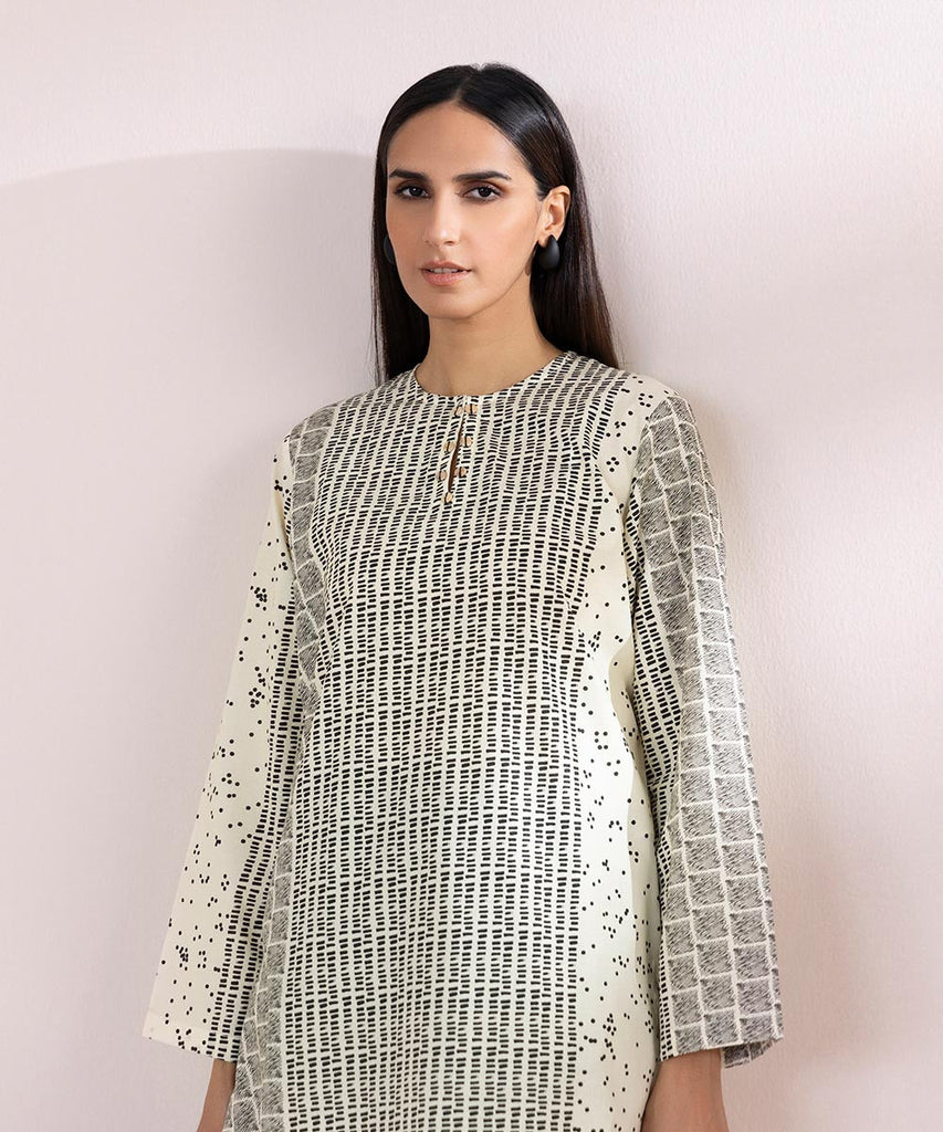 Channel effortless style in our off-white, printed cambric, long straight shirt.