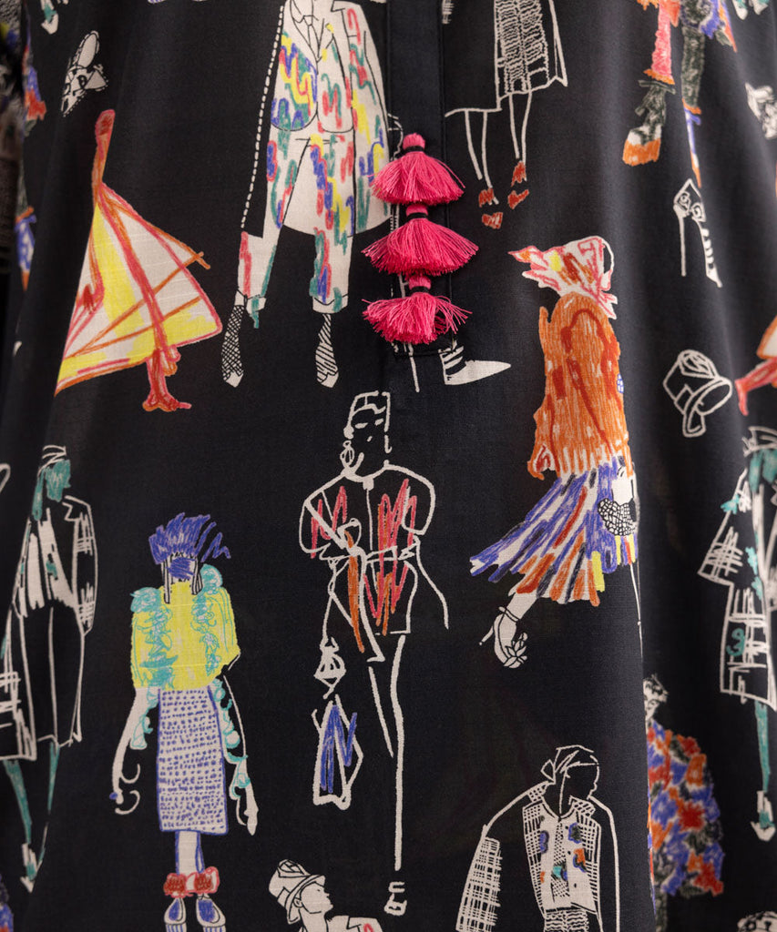 Curate a playful summer look with our printed black, textured lawn shirt in a boxy silhouette.