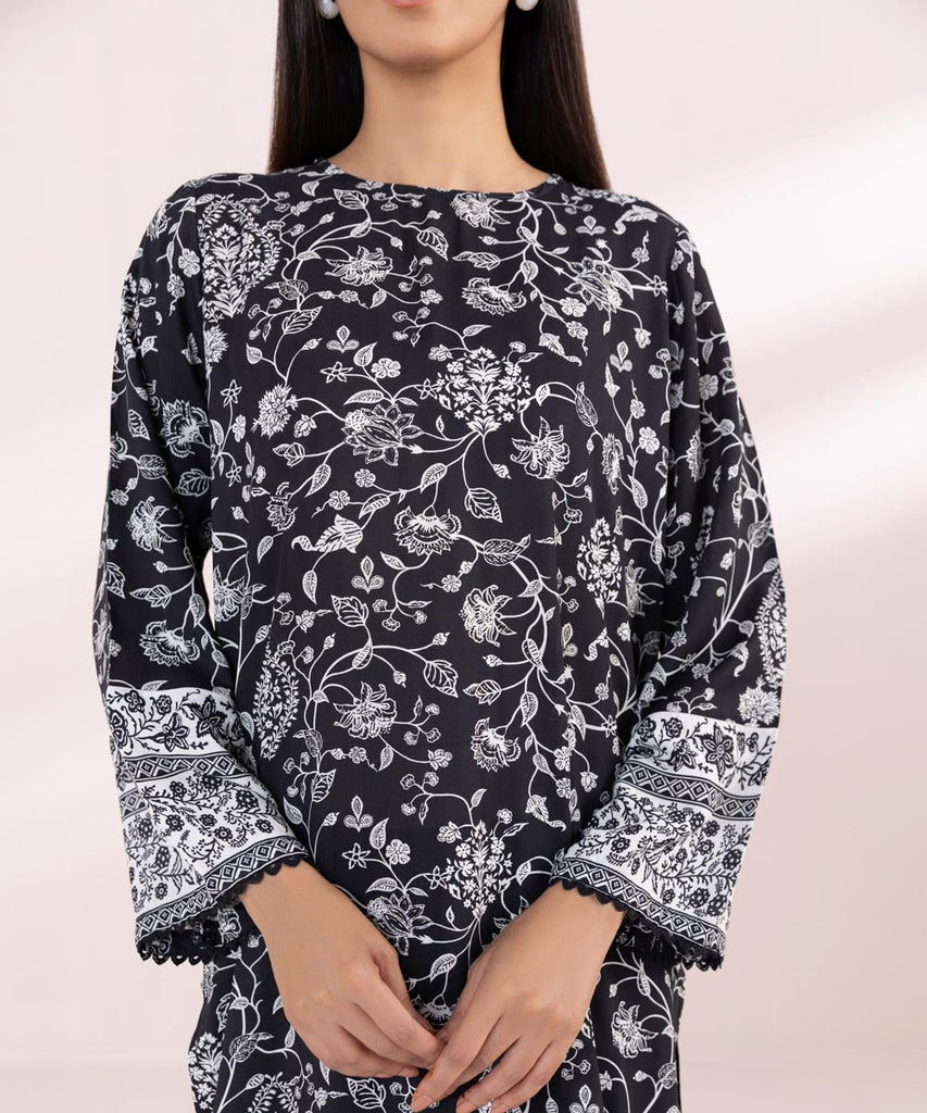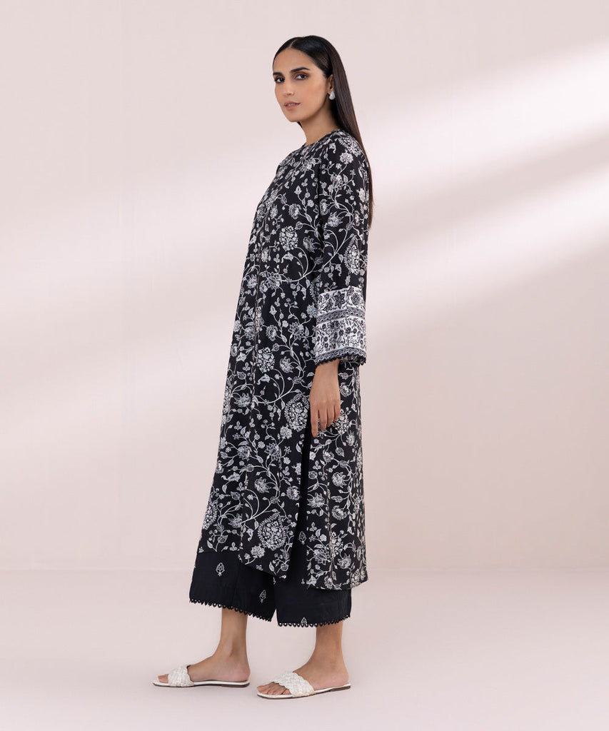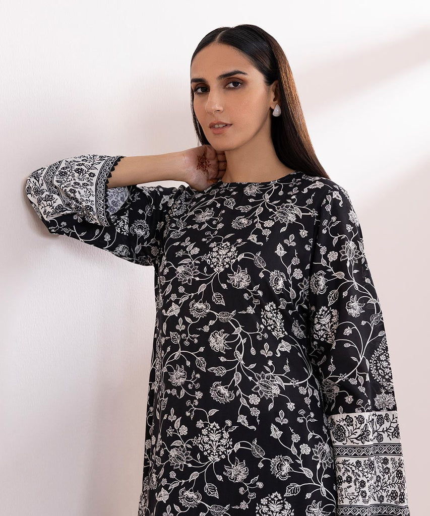 Channel effortless style in our printed black, Arabic lawn long straight shirt.