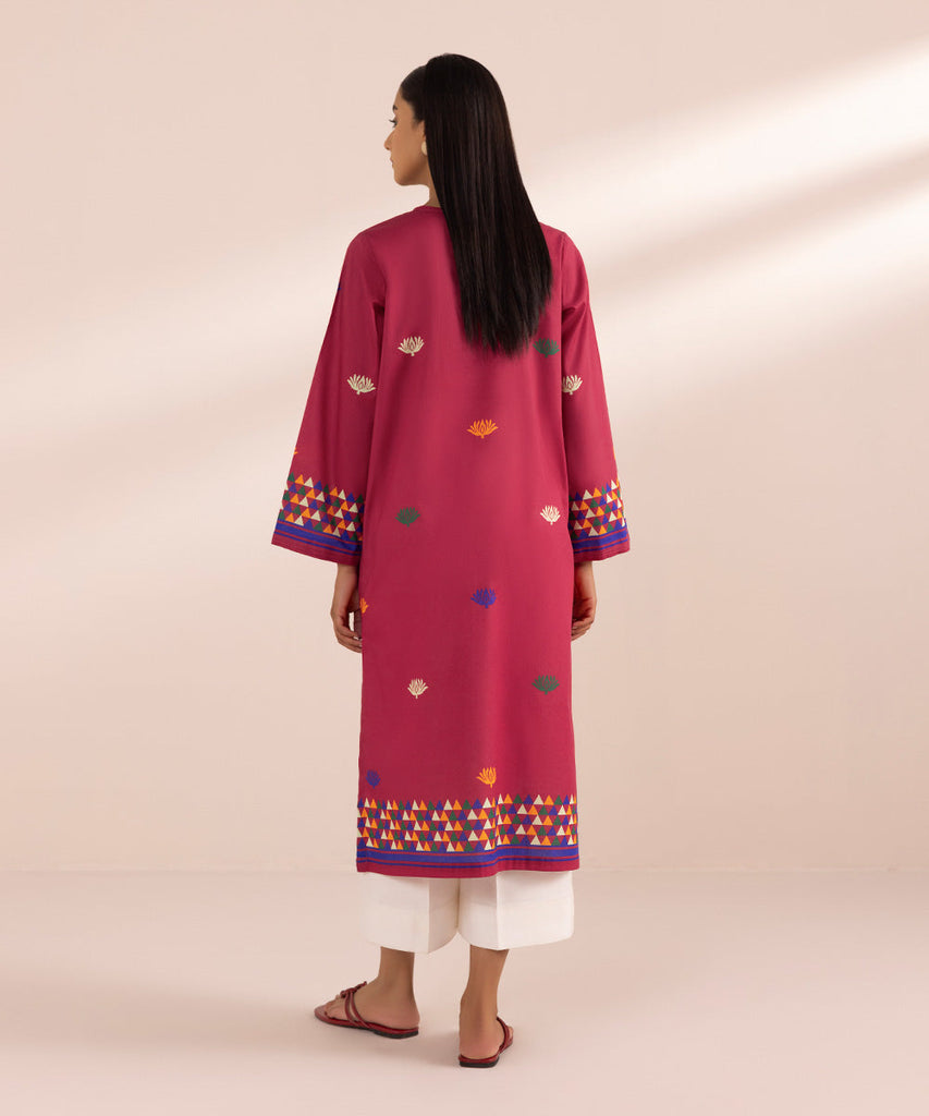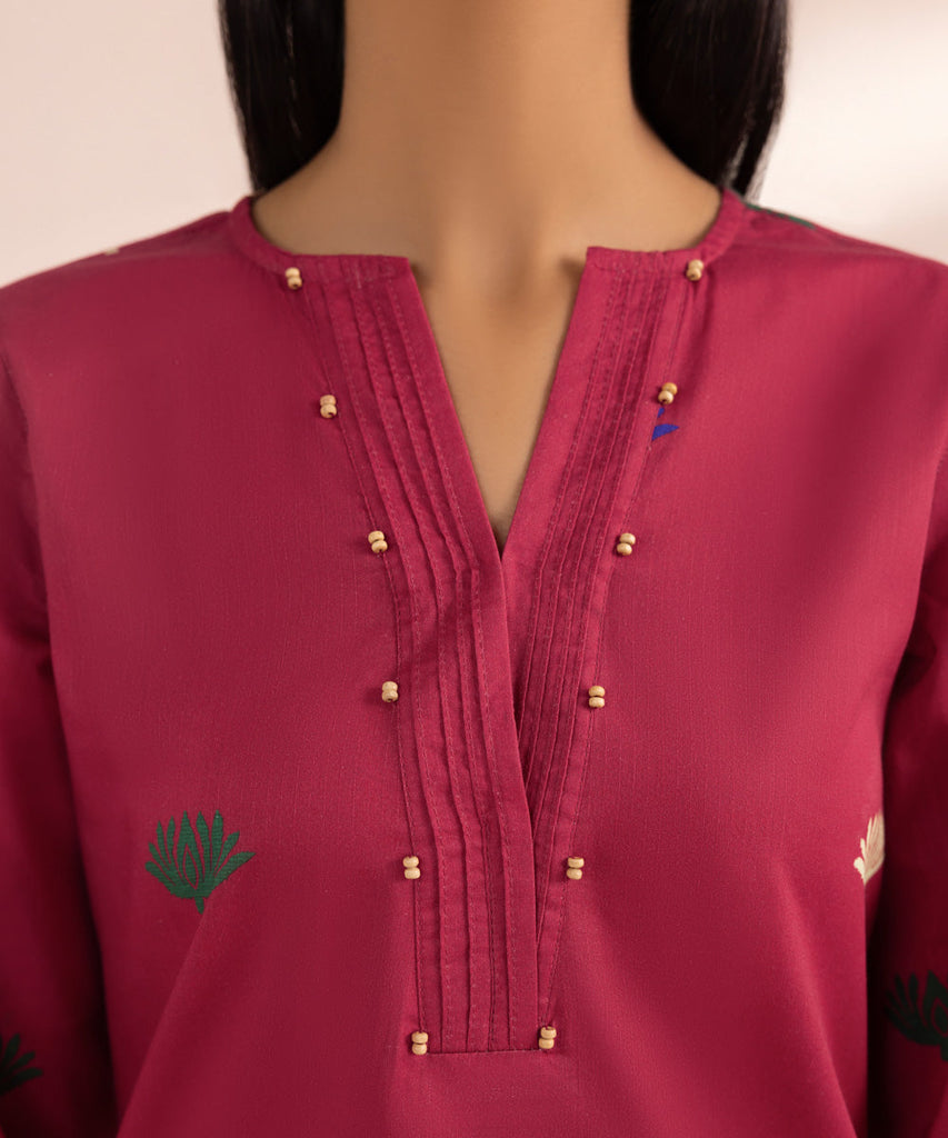 Opt for a chic everyday look with our printed berry red, long A-line shirt in textured lawn.