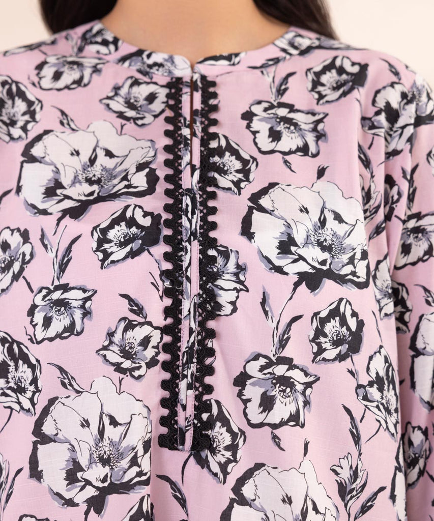 Channel understated allure this Eid in our printed soft pink, textured lawn long A-line shirt with lace detailing.