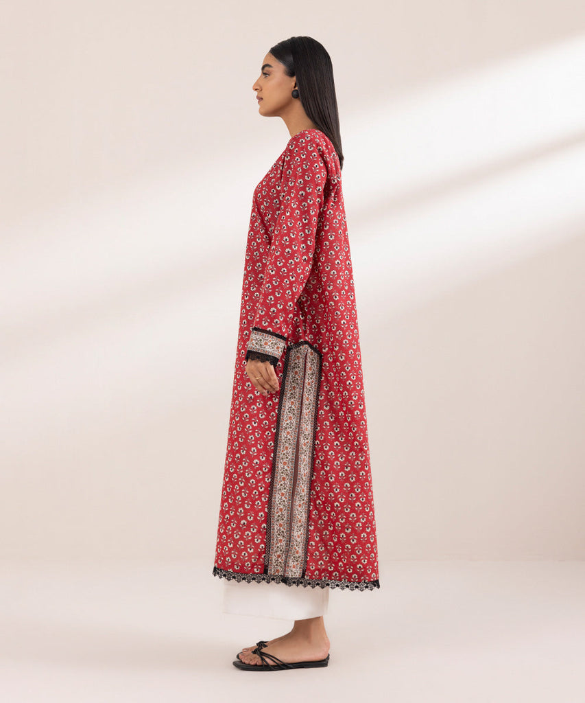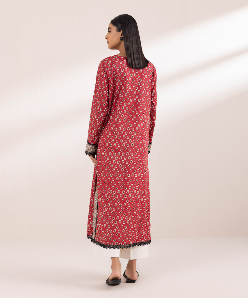 Curate a classy festive look with our printed red, long A-line textured lawn shirt.