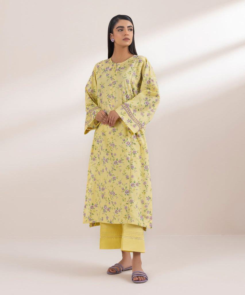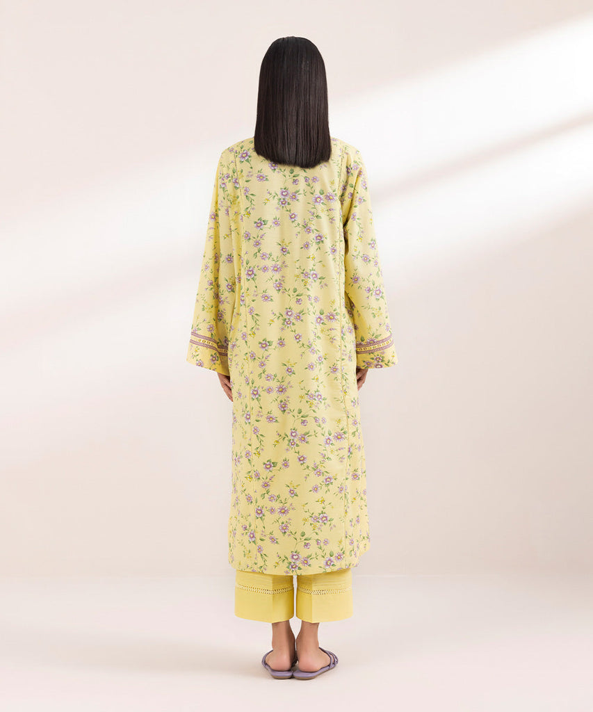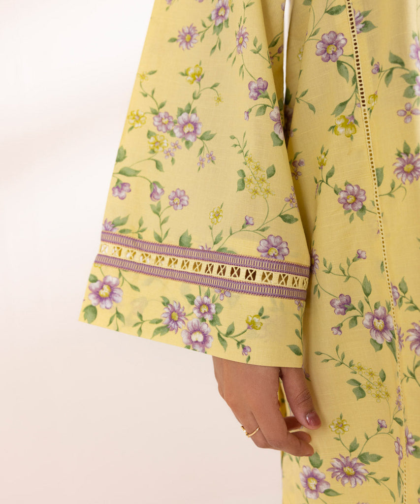 Curate a floral festive look in our printed yellow, long A-line textured lawn shirt.