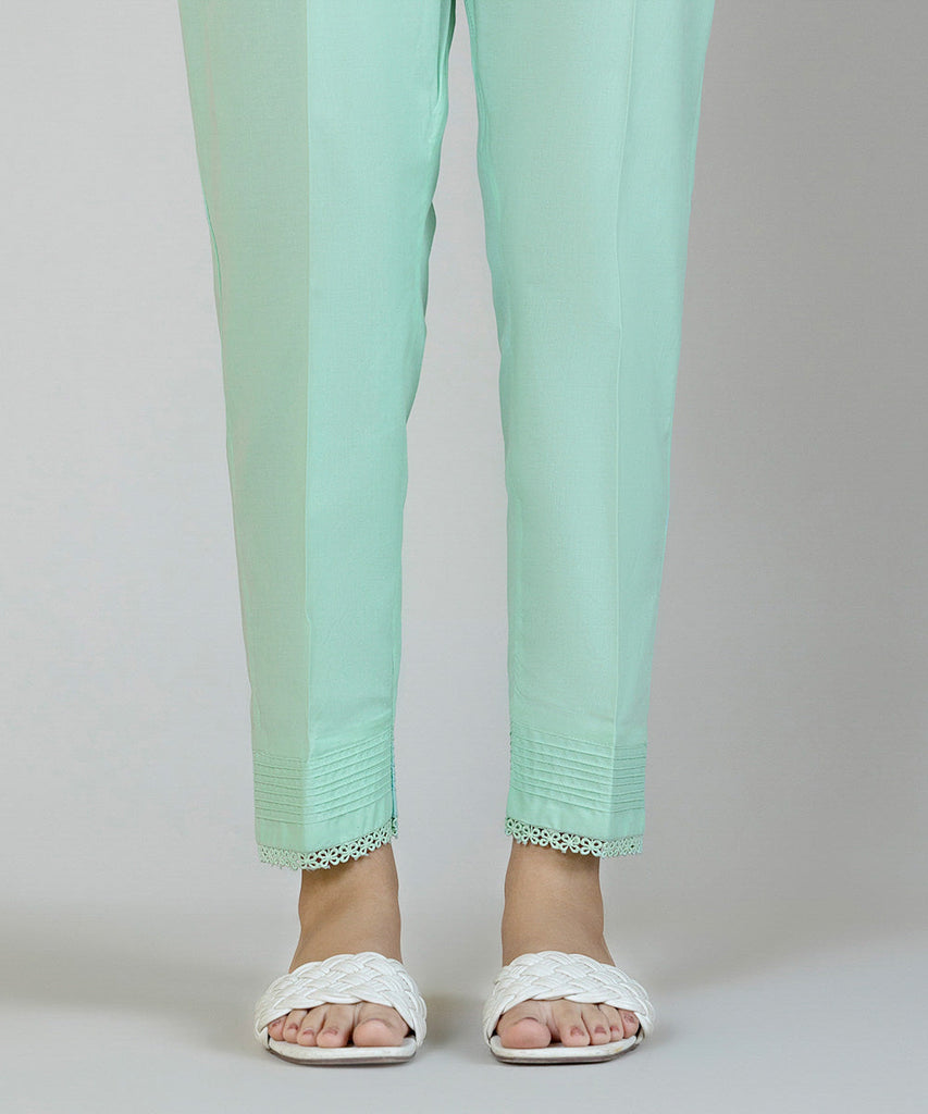 Complete your Eid look in our light blue cambric cigarette pants with lace.