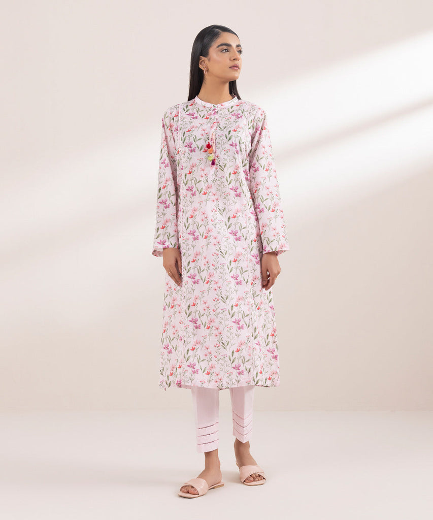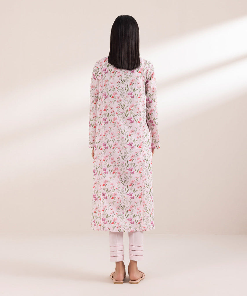 Curate a floral festive look in our printed soft pink, long A-line textured lawn shirt with lace.