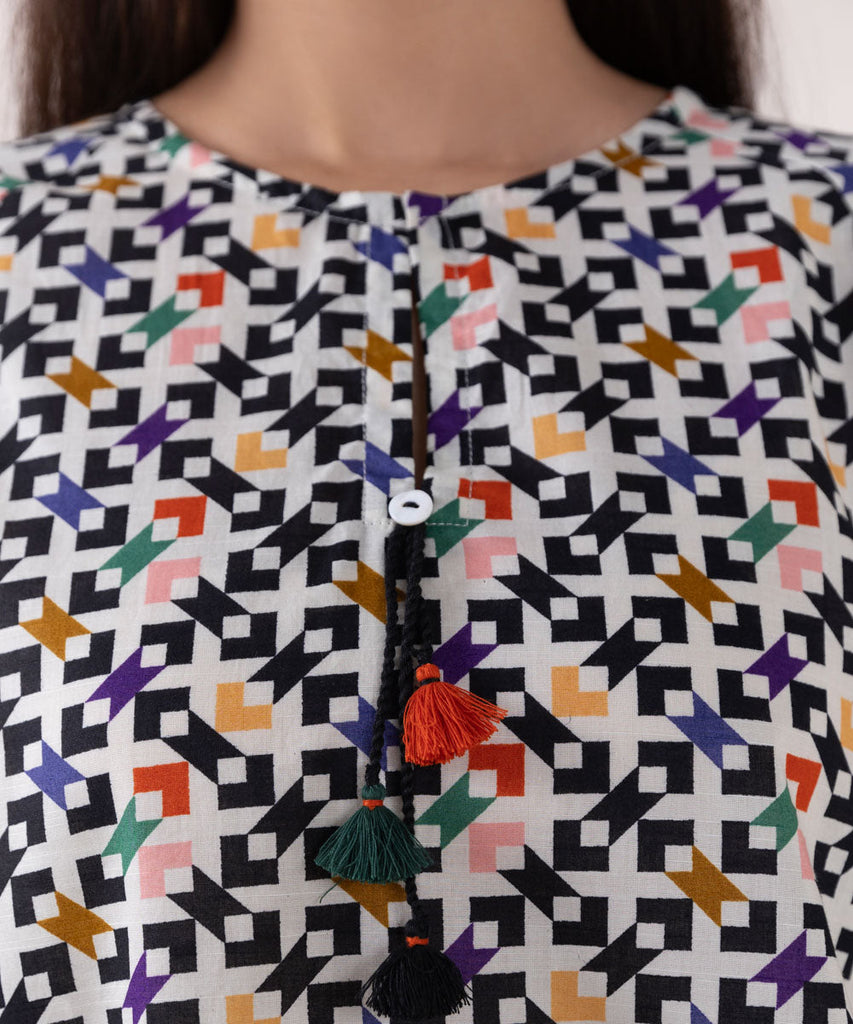 Printed Front, Printed Back, Full Sleeves, Round Neckline with a slit & Tassels