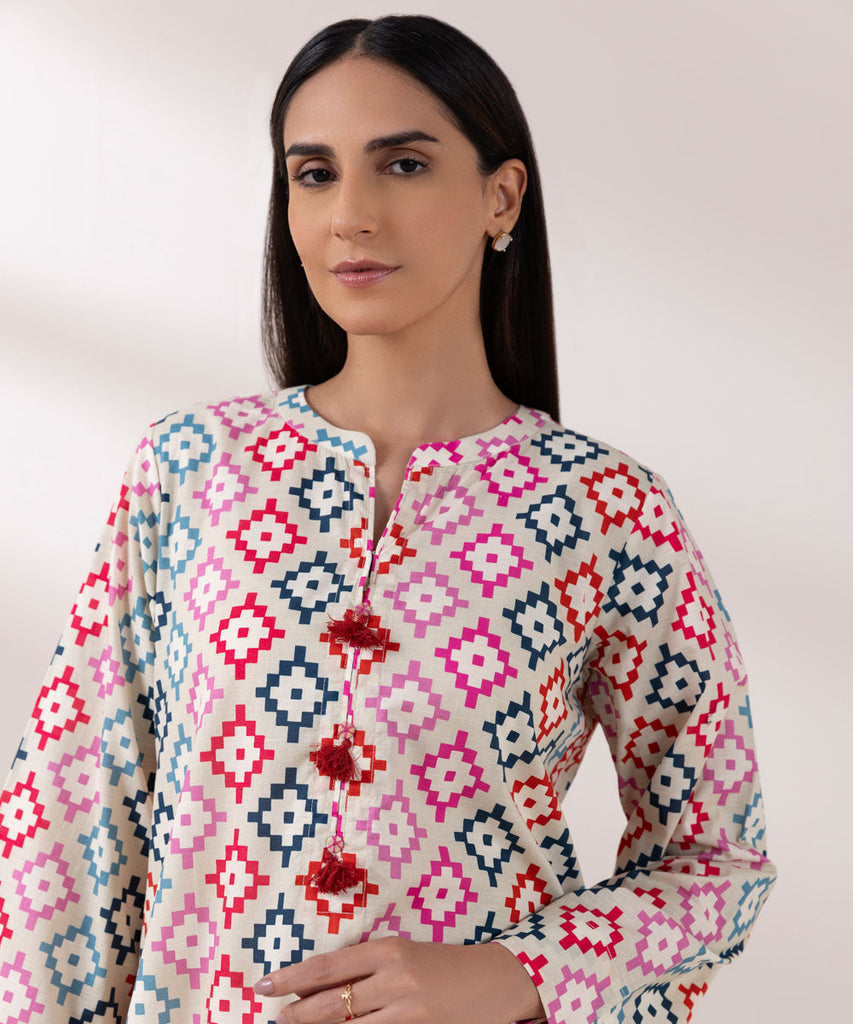 Printed Front, Printed Back, Full Sleeves, Band Neckline with a slit & tassels