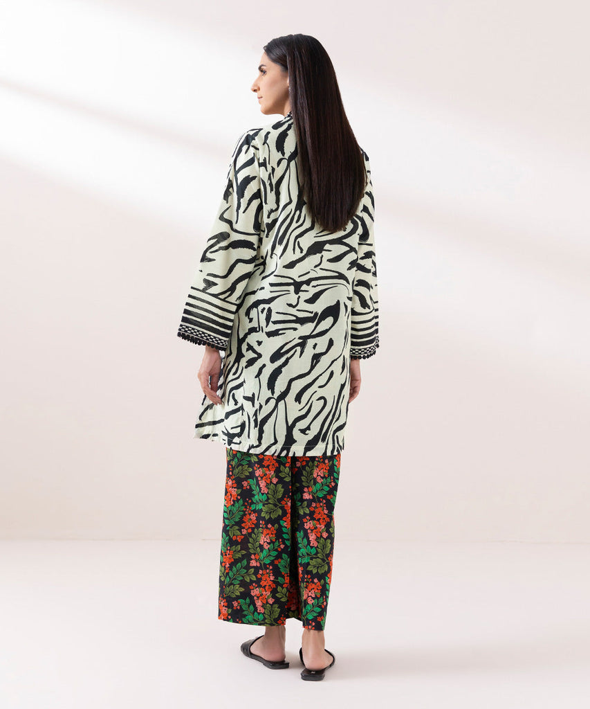 Create an easy breezy look this Eid in our printed black and white, textured lawn boxy shirt.