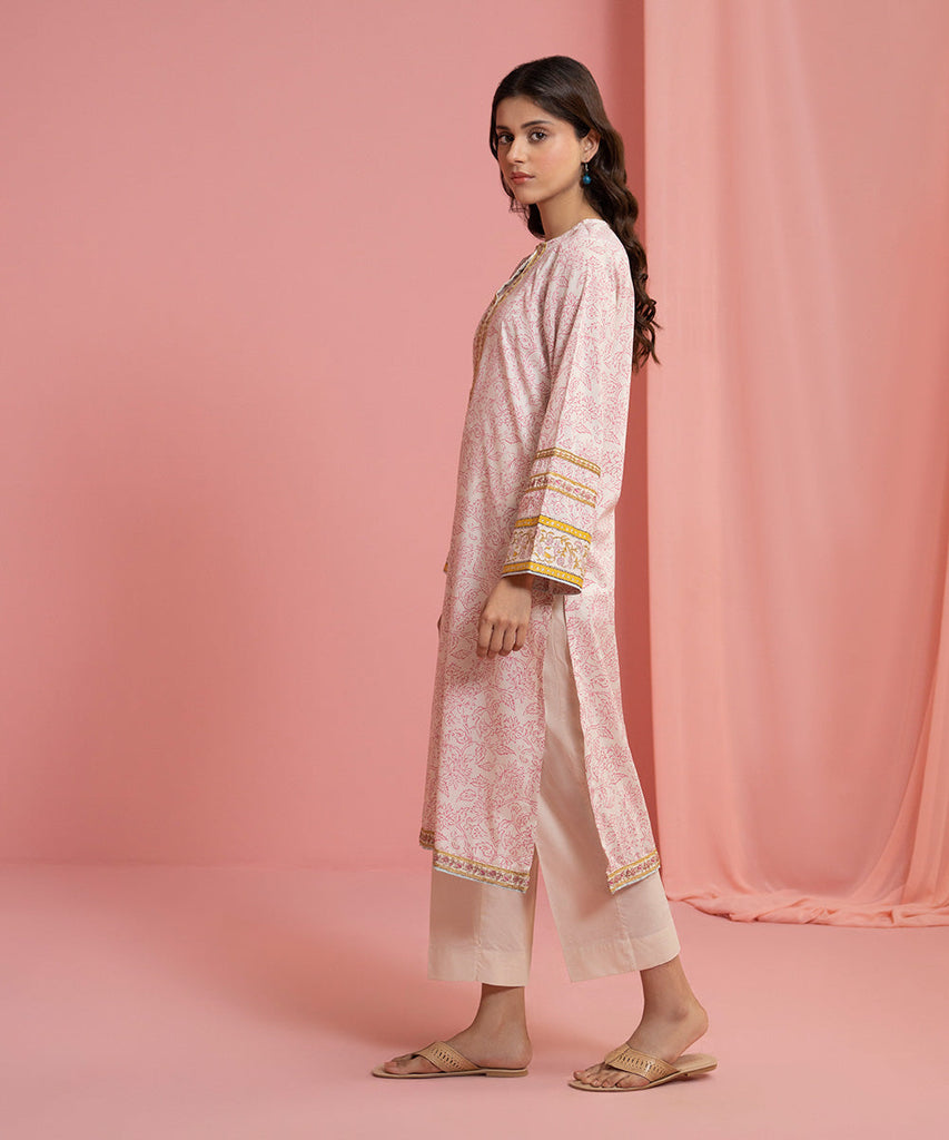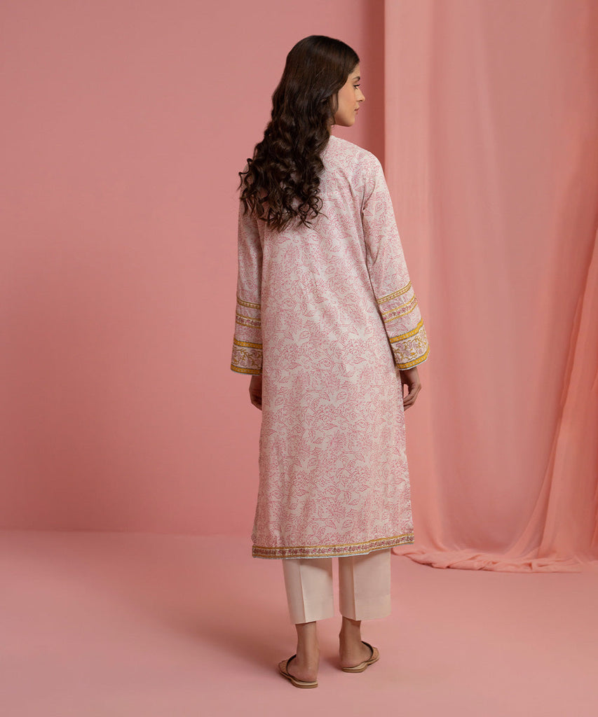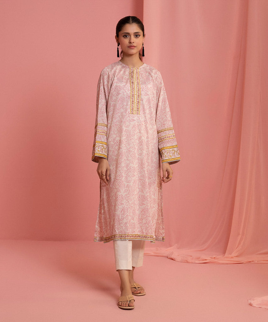 Printed Embroidered Front, Printed Back, Full Sleeves with Embroidered Border, Round Neckline with Placket