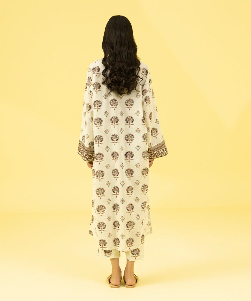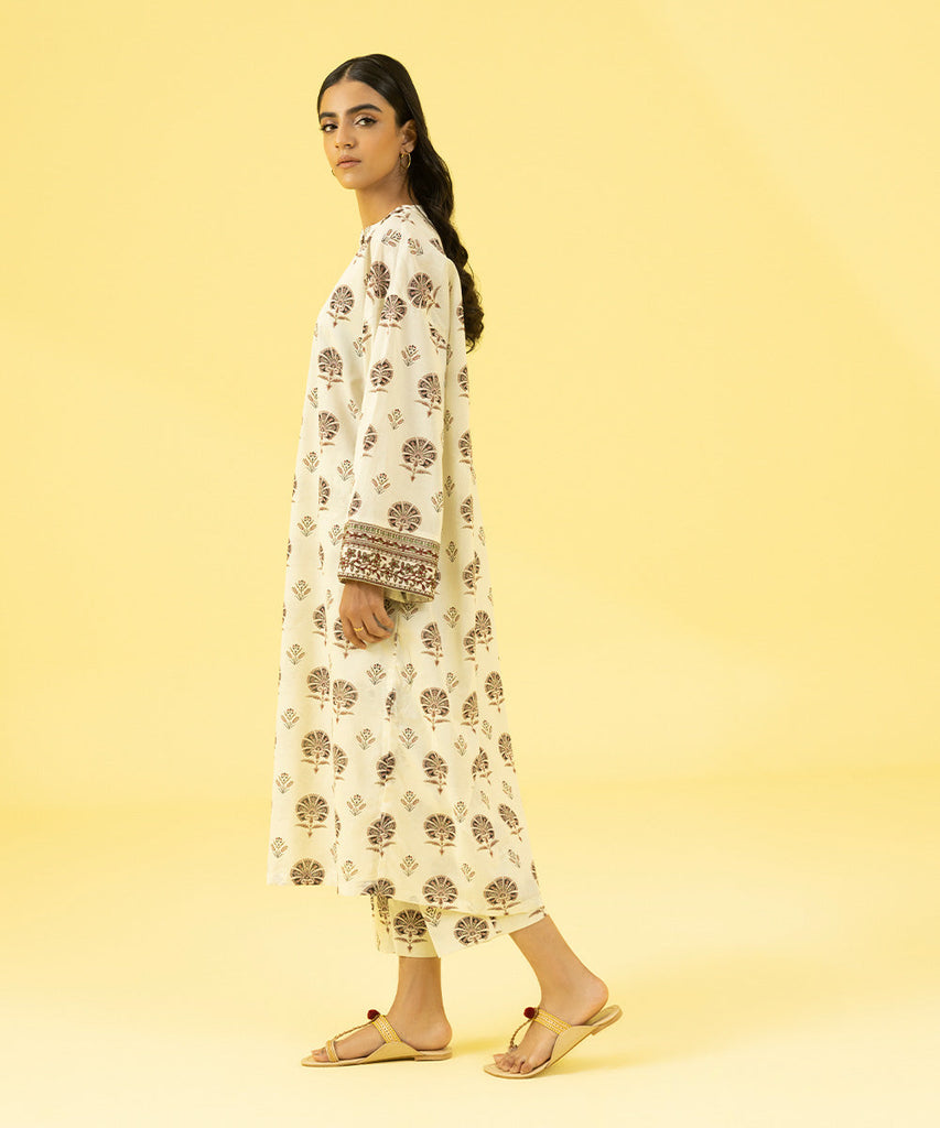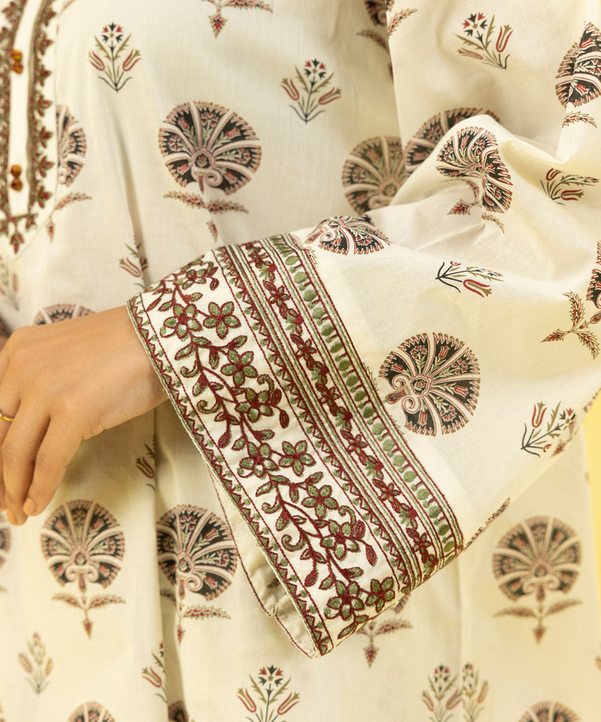 Printed Front With Embroidered Neckline, Printed Back, Full Sleeves With Embroidered Borders, Band Neckline With Placket