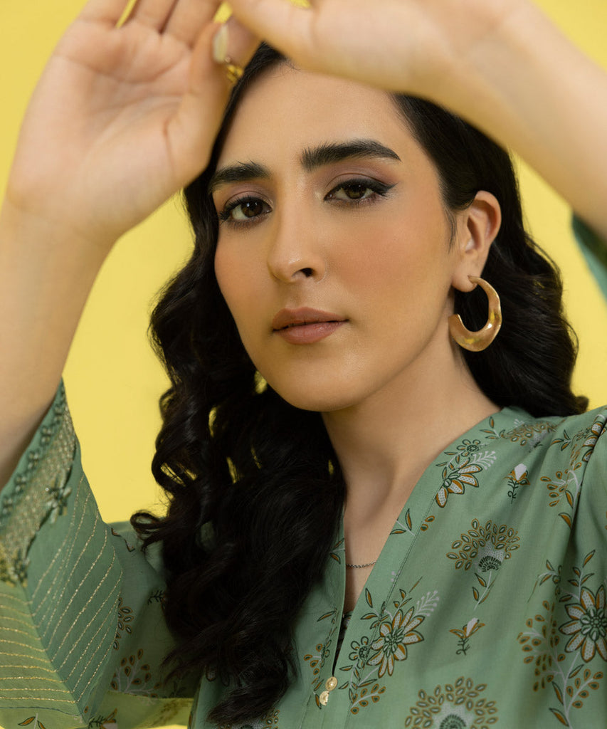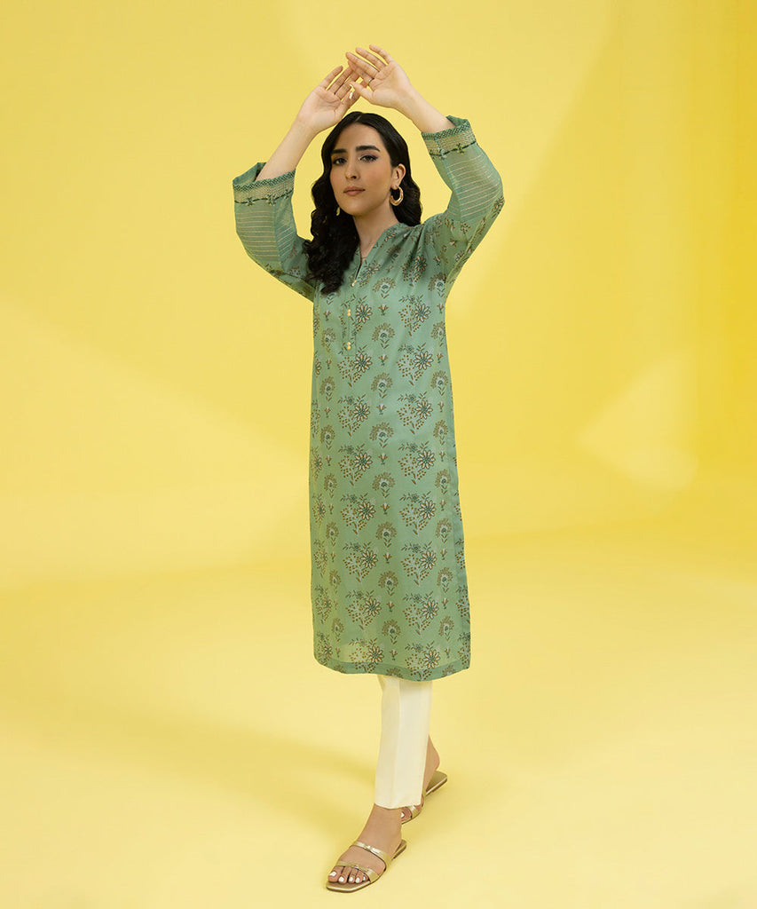Step into the summer season with our green straight silhouette featuring embroidered borders & Y-neckline.