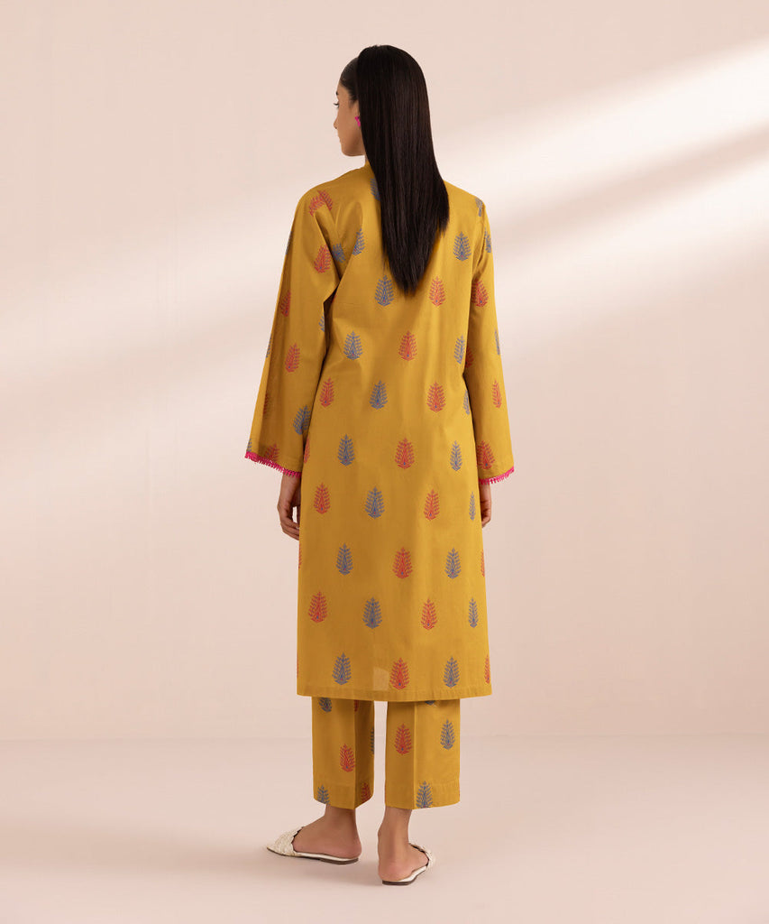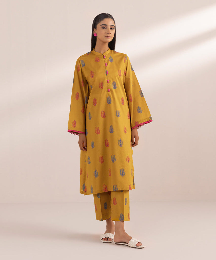 Create a radiant look in our burnt mustard, printed straight shirt featuring a band neckline with slit.