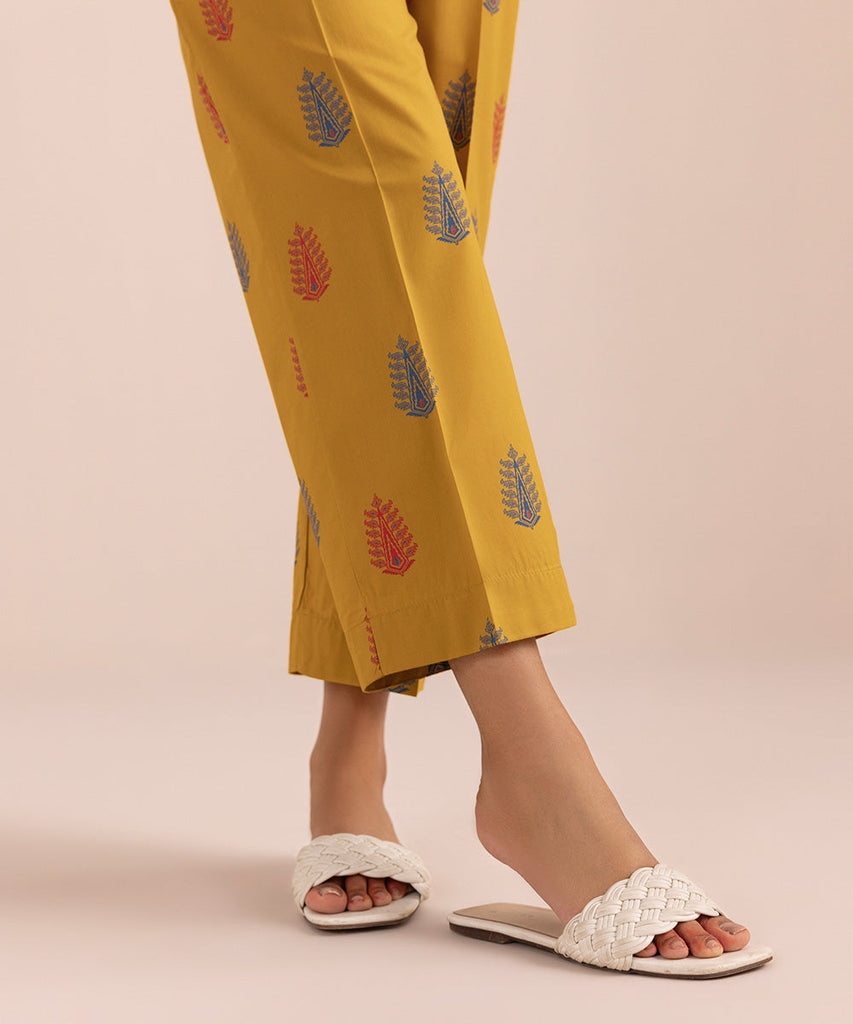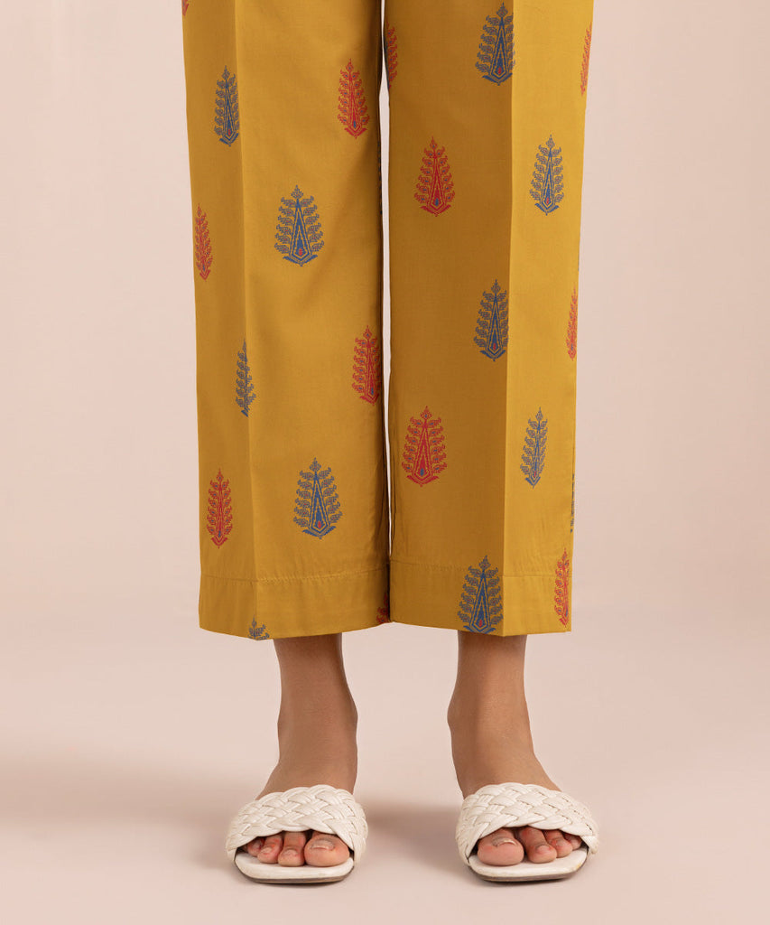 Complete your look with our burnt mustard, printed straight cambric pants.