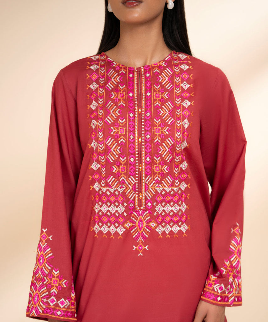 Embody regal style this Eid in our red, long straight, lawn shirt accentuated with embroidery.