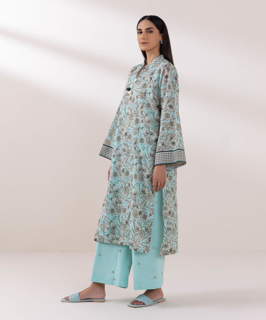 A-Line ShirtElevate your festive style with our sky blue printed A-line shirt featuring a band neckline with slit and...