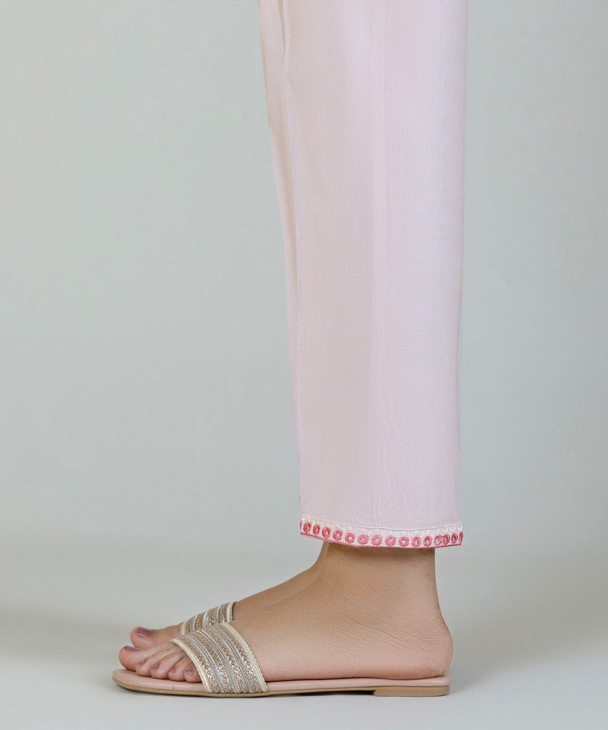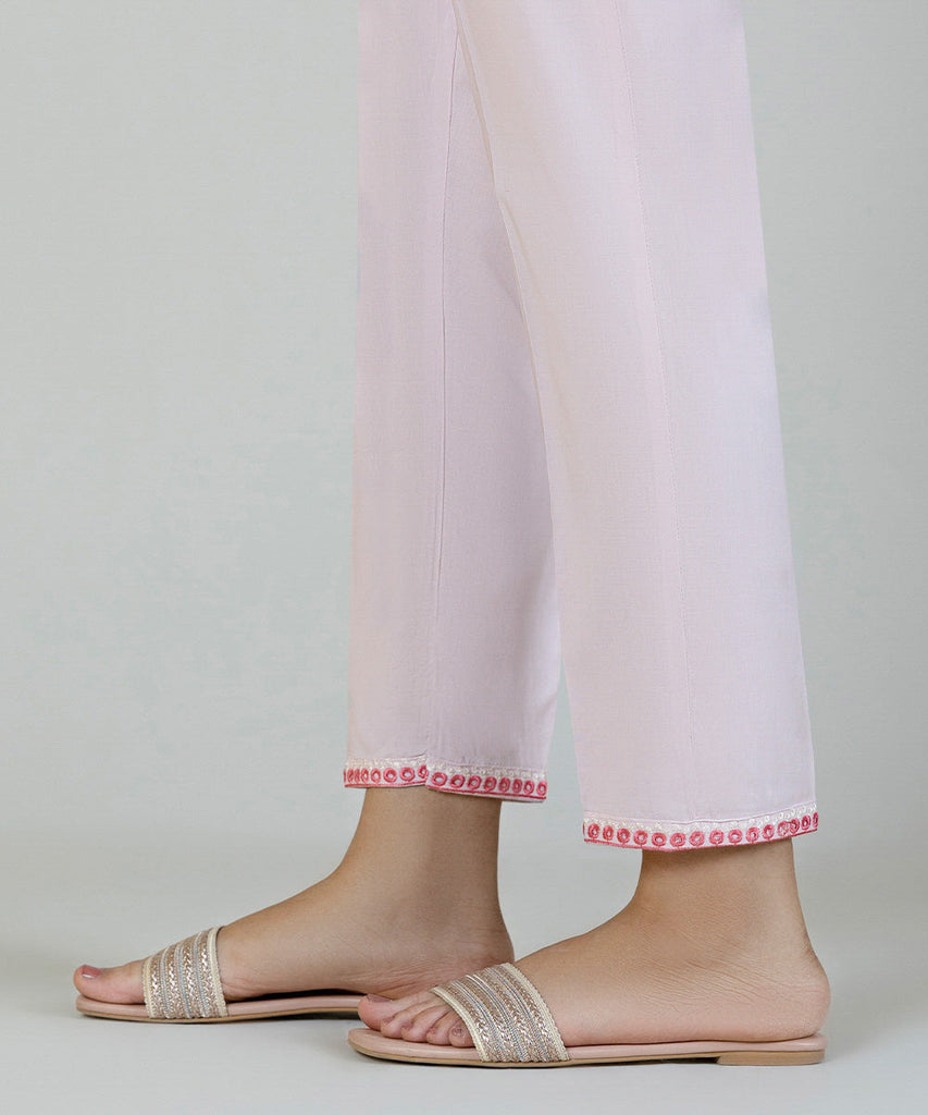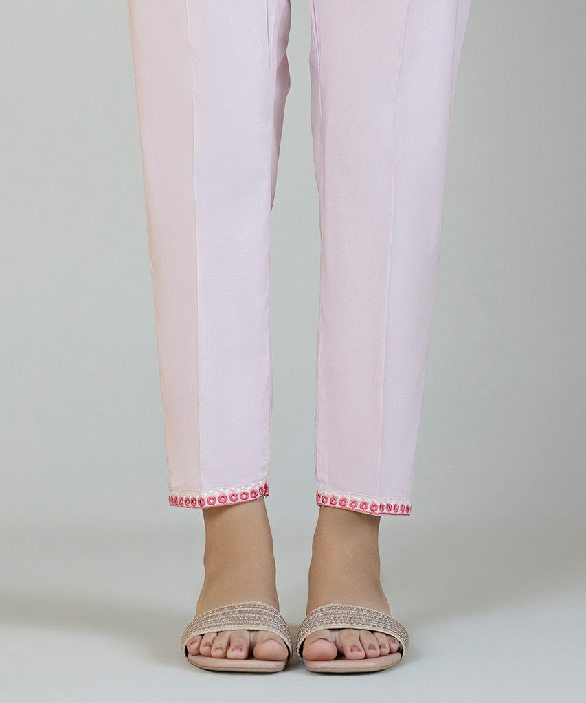 Complete your Eid look in our powder pink cambric cigarette pants with embroidery.