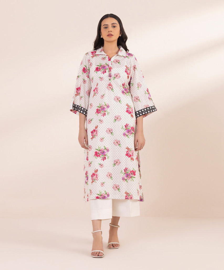 Elevate your style with our white printed A-line shirt featuring a collared neckline with placket.
