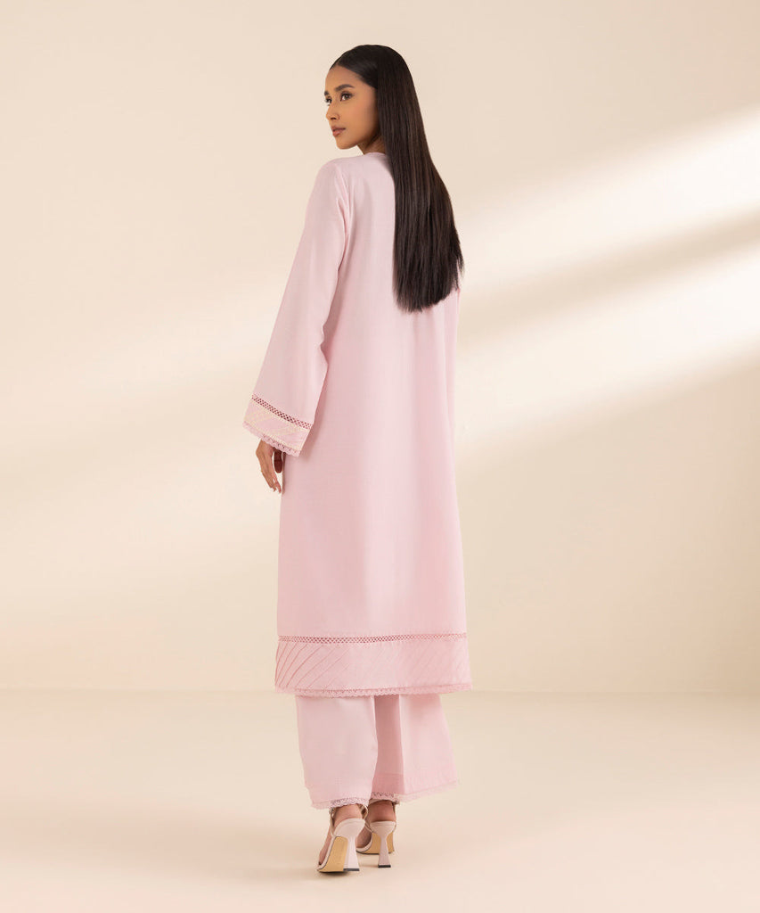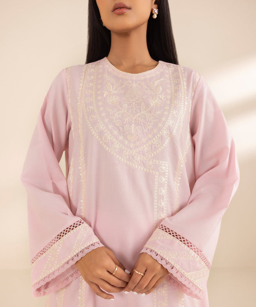 Make a striking statement this festive season in our pastel pink embroidered chikankari  shirt featuring a round neckline with lace detailing.