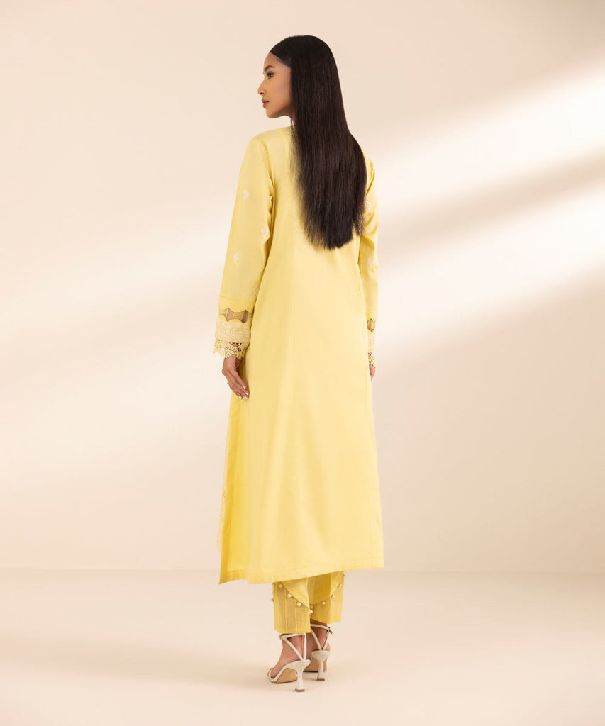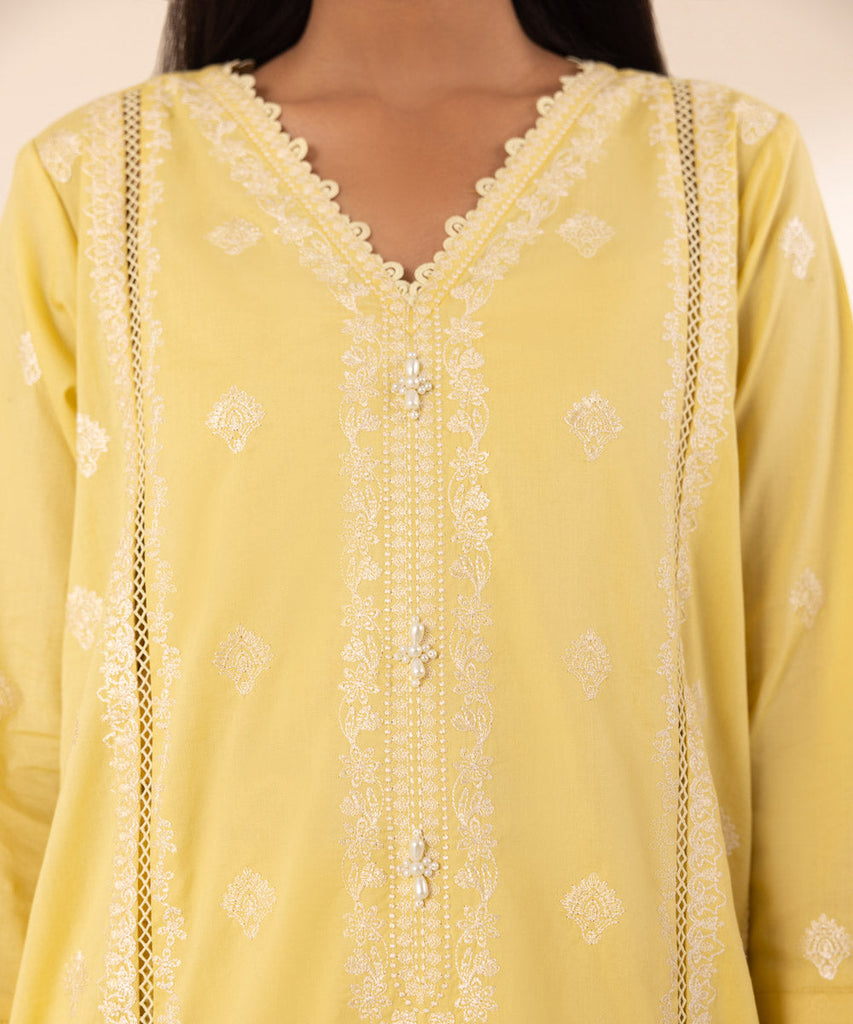 Curate the perfect festive look with our yellow embroidered chikankari A-line shirt featuring a V-neckline.
