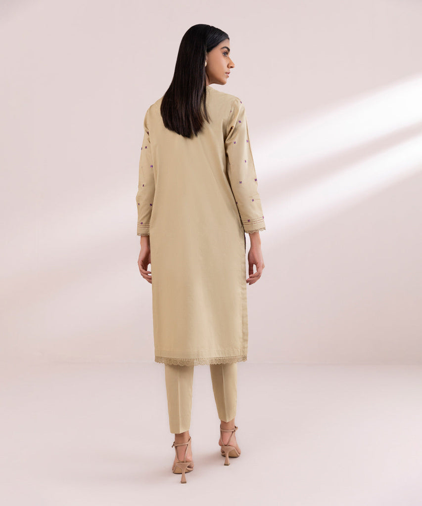 Breeze through the day with our embroidered camel brown, long A-line shirt in textured lawn accented with lace.