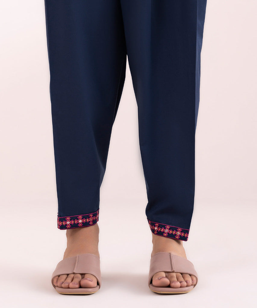 Create a traditional look with our navy blue, embroidered cambric tapered shalwar.