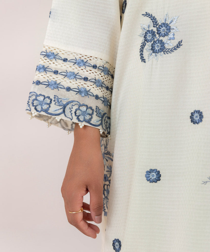 Curate the perfect festive fit this Eid with our off-white embroidered A-line shirt featuring a Y-neckline.
