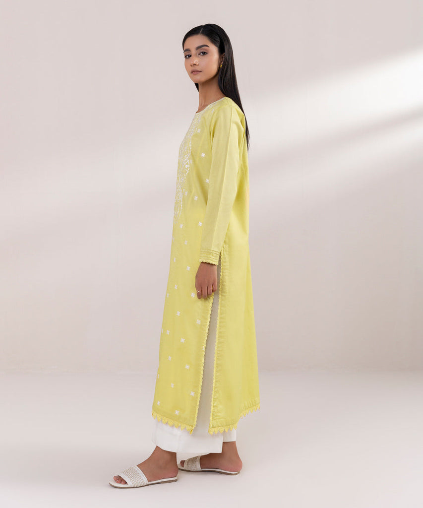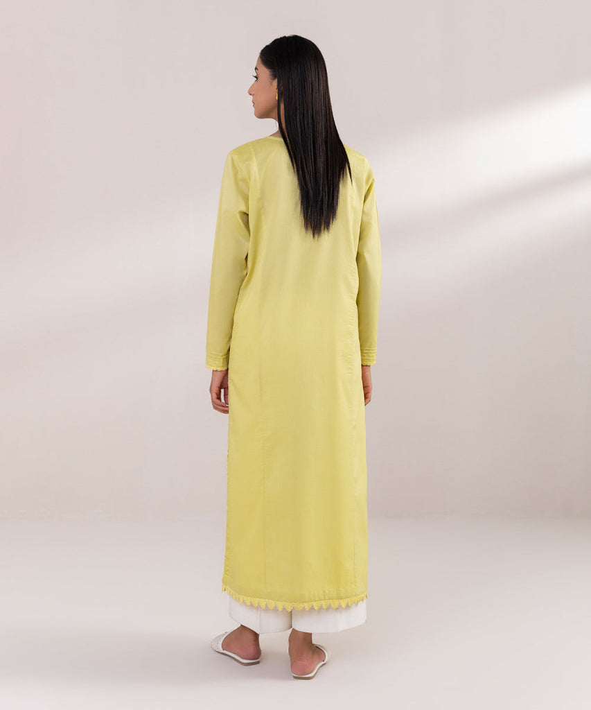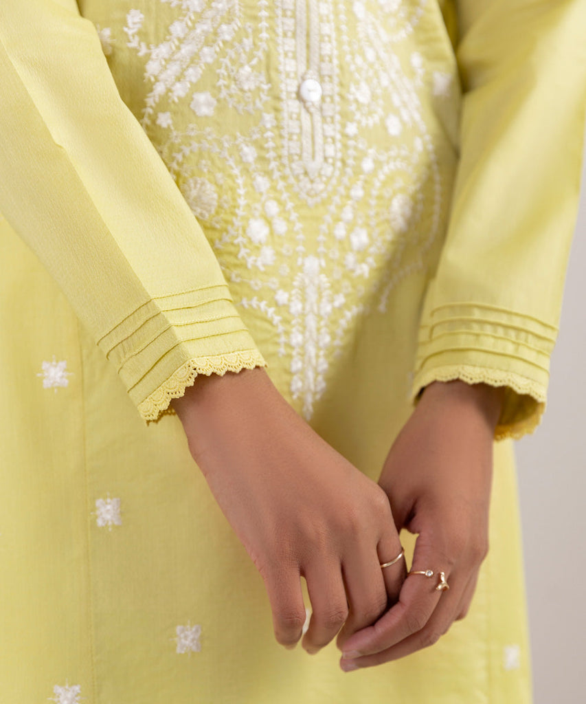 Elevate your festive style with our yellow embroidered A-line shirt featuring a round neckline.