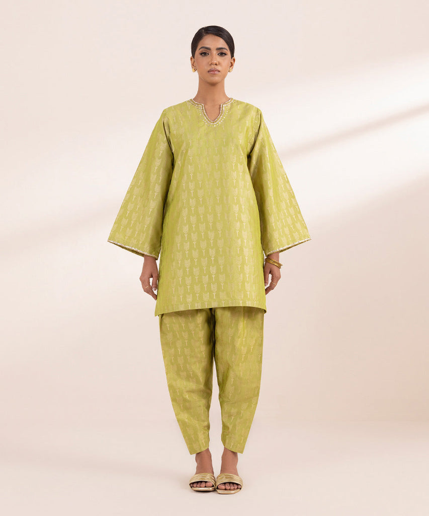Boxy ShirtComplete your Eid look with our lime green boxy shirt featuring a round neckline with slit. Details: Dyed F...